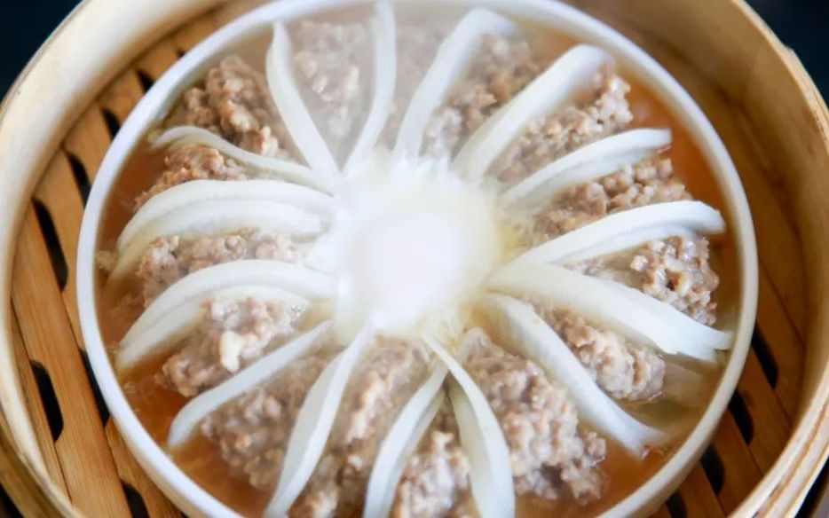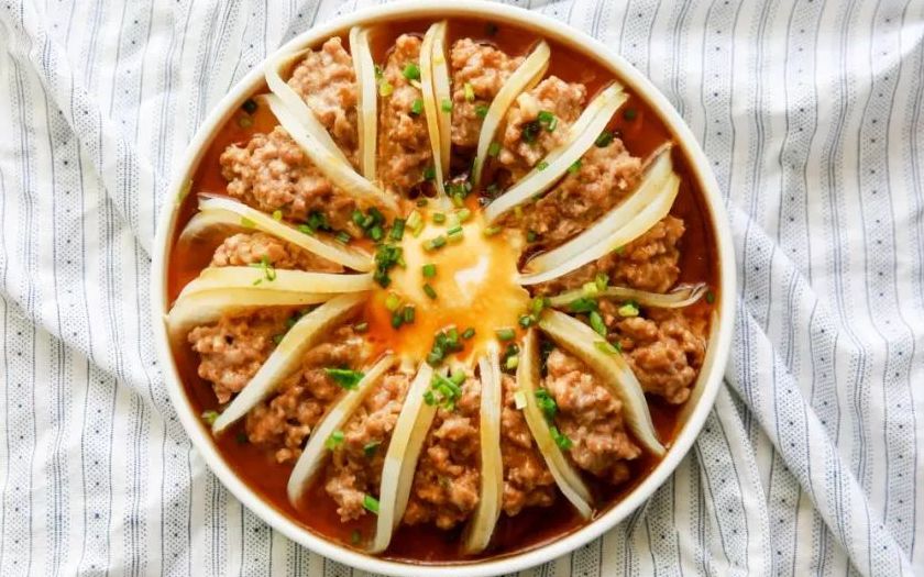 5. 蒸蘿卜片肉末:在蘿卜片肉末中間打入一個(gè)雞蛋,放入鍋中隔水大火蒸10分鐘左右。