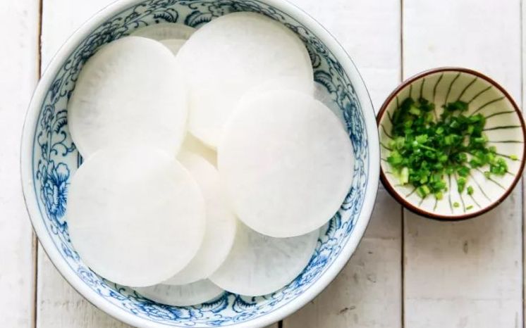 1.處理食材: 蔥切末,白蘿卜洗凈不要去皮,用刀切成圓形薄片備用。