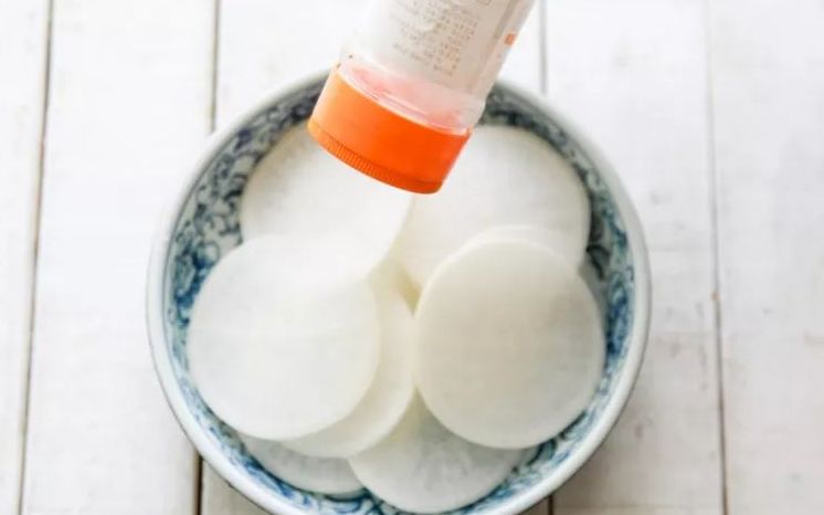 2. 腌蘿卜:將切成薄片的蘿卜,放入碗中加入適量鹽,抓均勻腌制10分鐘左右