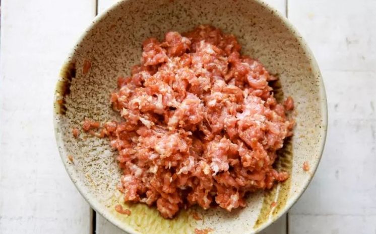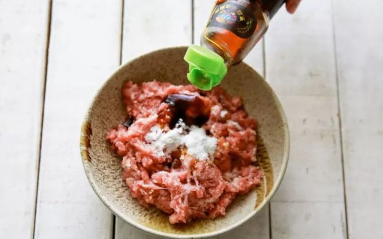 3. 調(diào)制肉餡:肉糜中加入1瓷勺蠔油、1瓷勺老抽、1瓷勺淀粉、適量雞精、適量白糖、少許鹽。