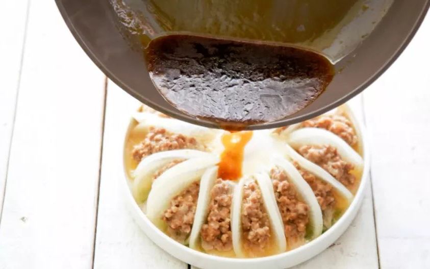 把煮好的醬汁淋入蒸好的蘿卜蒸肉中,撒上蔥末,好吃的蘿卜蒸肉做好啦!