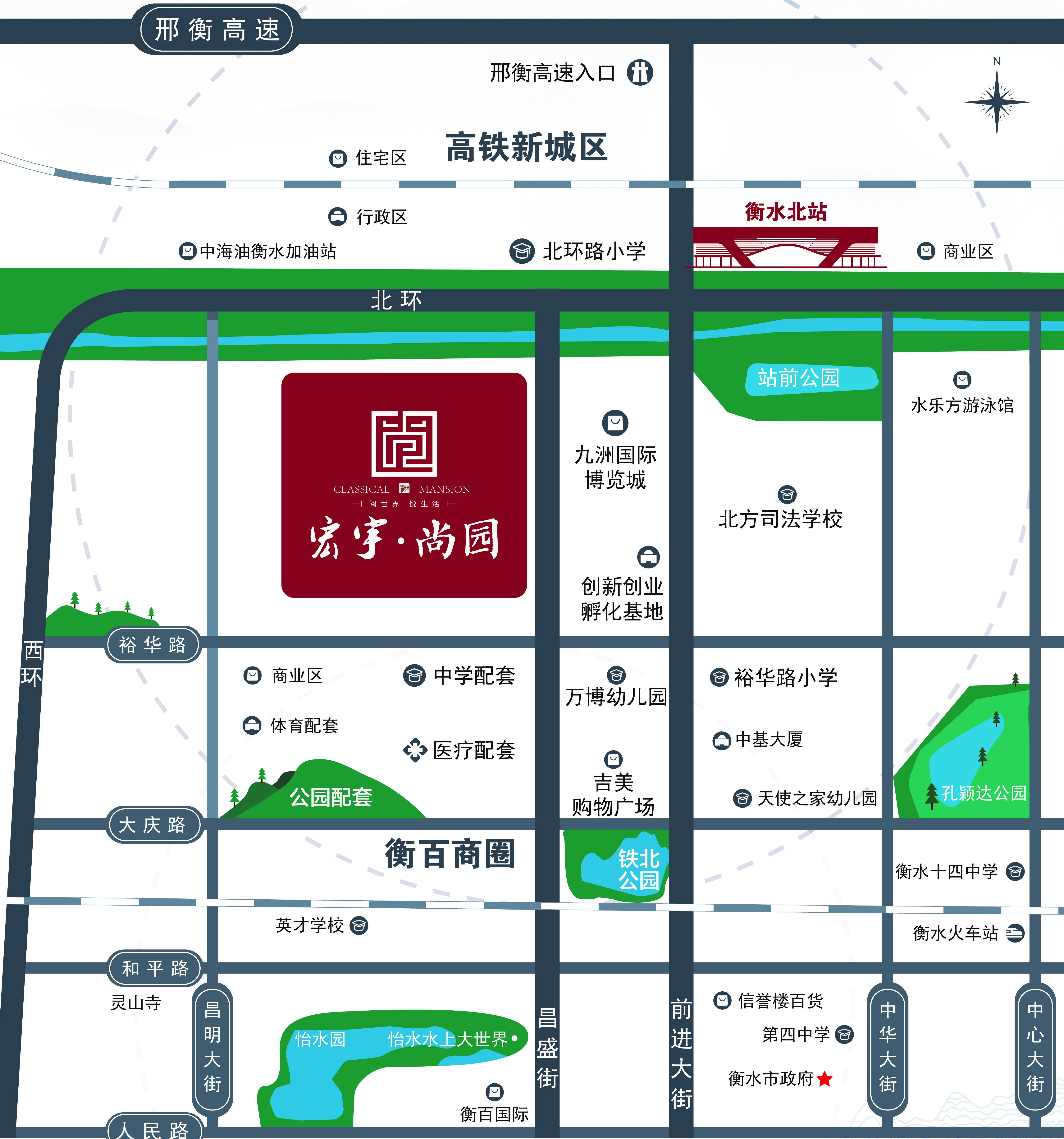 宏宇集團一直秉承奉獻精品,服務百姓,創造房地產開發新高度,深耕京津冀魯,勇立時代之潮。宏宇·尚園項目是宏宇集團在我市傾心打造的集科、教、文、衛于一體化的現代生活社區。項目位于北環路與昌盛街交界處西南角,北臨曹班店渠自然生態景觀帶,周邊已拍出3塊住宅用地。東側臨市政配套(消防用地、公交站)。項目周邊規劃道路均在規劃修建中,規劃路通過昌盛街聯系城市主干道北環西路及前進北大街,北環西路及前進北大街為項目對接城市的主要外部聯系道路,出行交通較便利,實現了出則繁華,入則靜謐的居住需求。