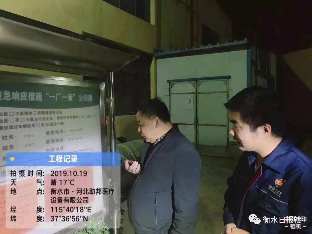10月19日晚11時,市生態環境局的執法人員兵分多路,對轄區內的工業企業,在重污染天氣應急響應期間的落實減排情況,開展了夜查行動。執法人員先后到桃城區的衡水艾科塞林橡塑制品有限公司、衡水中冀塑料科技有限公司,對企業的重污染天氣二級響應執行情況進行了突擊檢查,發現兩家企業均已落實應急響應預案要求,對生產線進行了停限產。