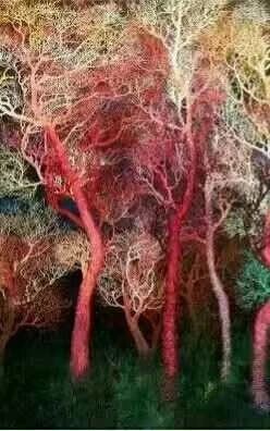并排的幾幅畫是各種各樣的樹林,這些樹在不同的季節(jié)和白天不同的日照時(shí)間,變化著不同的顏色,有紅樹林,藍(lán)樹林,綠樹林,紅白紫相間的樹林,那些脫光了葉子的細(xì)小的密密彎彎的細(xì)樹枝,像菊花一樣美。夢(mèng)君告訴我,《多彩樹林》《東劉莊》《梨園深秋》《童年印象》《村邊寫生》《樹枝》等這些作品都是她的故鄉(xiāng)東劉莊村(河北省衡水市饒陽(yáng)縣大官亭鄉(xiāng)東劉莊村)真實(shí)場(chǎng)景。我被這些畫面吸引著,思緒牽動(dòng)著我到了東劉莊的村頭,走進(jìn)了滿園紅葉的梨園,樹枝在面前晃來(lái)晃去。我被她的家鄉(xiāng)感動(dòng)了。