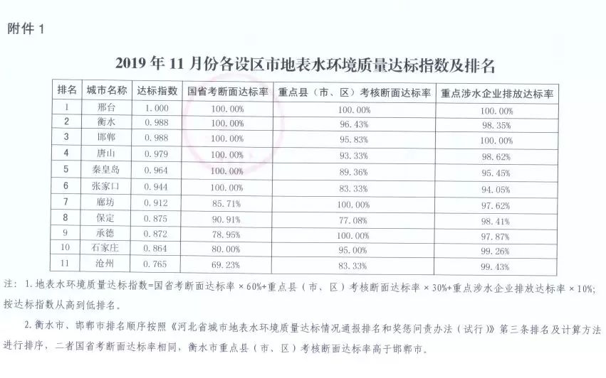 根據《河北省城市地表水環境質量達標情況通報排名和獎懲問責辦法(試行)》,近日,省水污染防治工作領導小組辦公室通報了2019年11月全省地表水環境質量達標情況排名,對排名前三位的邢臺市、衡水市、邯鄲市進行獎勵,對排名后三位的滄州市、石家莊市、承德市扣減資金。