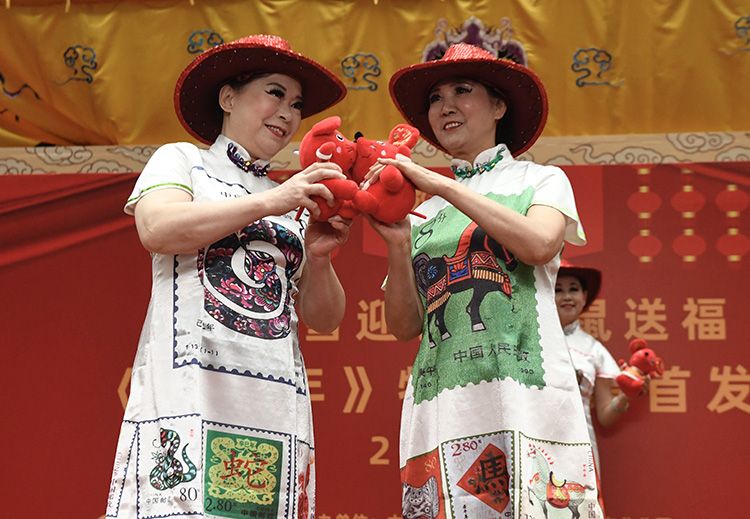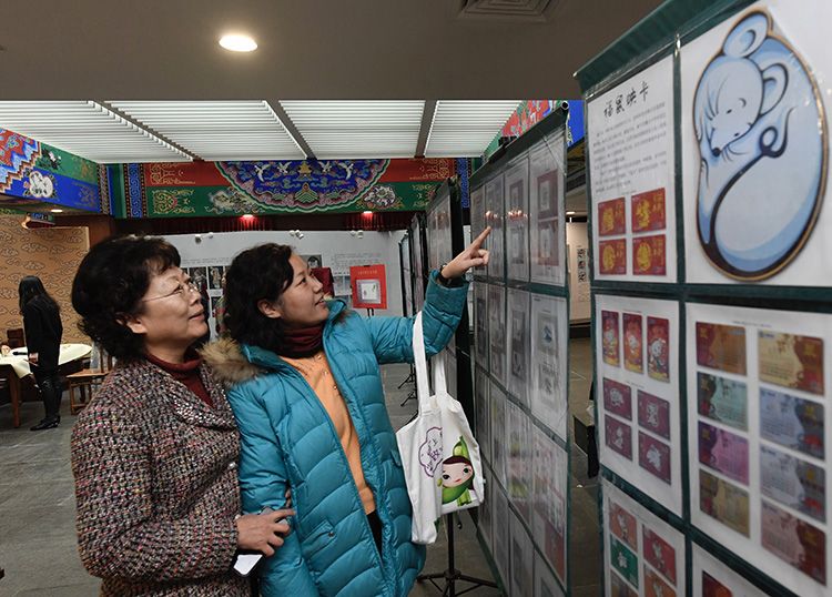 市民在觀(guān)看有關(guān)鼠年生肖郵票的展覽。