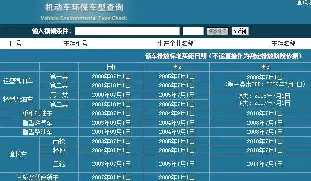 2017年前生產和進口車可通過輸入車輛型號進行查詢,其中車輛型號、發動機型號、生產日期必須同時符合才能判定排放階段。