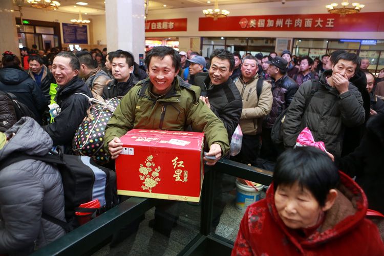 1月9日深夜,北京站候車室,一位旅客懷抱北京特產紅星二鍋頭當做年貨。