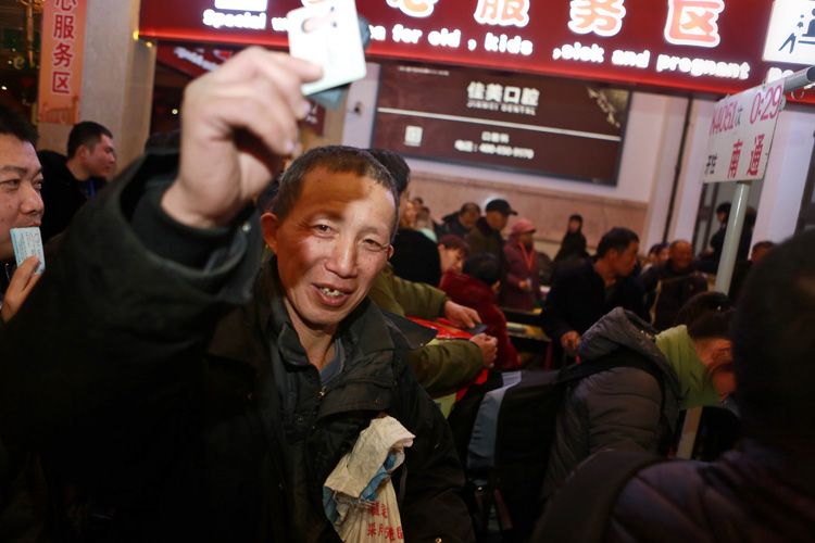 1月9日深夜,北京站檢票口,搭乘春運首趟臨客的旅客高舉身份證,準備踏上回家旅程。