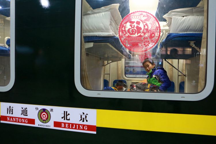 1月10日零時許,在春運首趟增開的北京——南通K4051次列車上,窗戶上貼著紅紅的窗花。