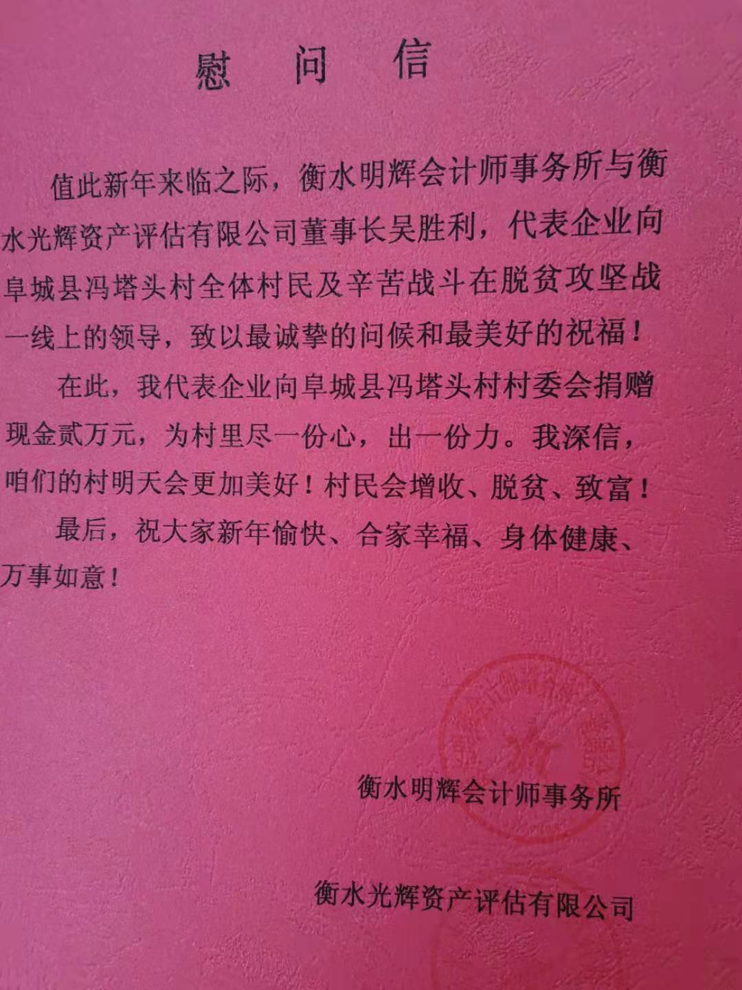 近日,衡水市阜城縣阜城鎮馮塔頭村黨支部書記馮國躍將寫有“情系家鄉,大愛無疆”的錦旗交到了衡水明輝會計師事務所與衡水光輝資產評估有限公司董事長吳勝利手中,感謝他對家鄉脫貧振興的資助。