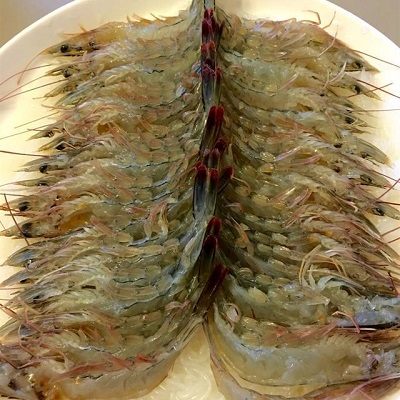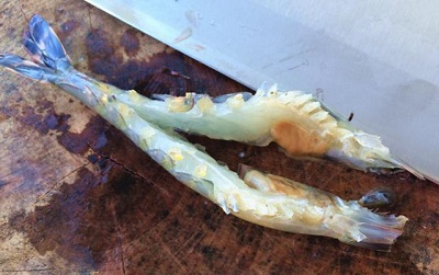 3、將蝦清洗干凈,放在板上,用手摁住大蝦,將蝦開邊至最后一節,去除蝦包和蝦線,清洗干凈。