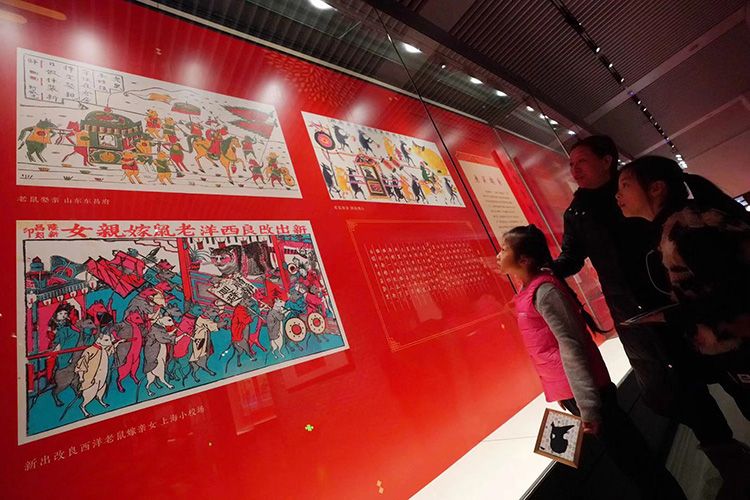 展覽以圖文結合的形式“鼠年說鼠”,介紹了生肖與干支的來歷,以及民間的祀鼠活動;通過年畫、年俗傳說等內容,概述小年、除夕、元宵等重要節點的慶歲風俗;上百件衡水剪紙、姑蘇年畫、楊柳青年畫、北京剪紙等優秀非遺作品,與國家圖書館館藏40余種經典文獻相結合,引發觀眾深藏心底的年味記憶。