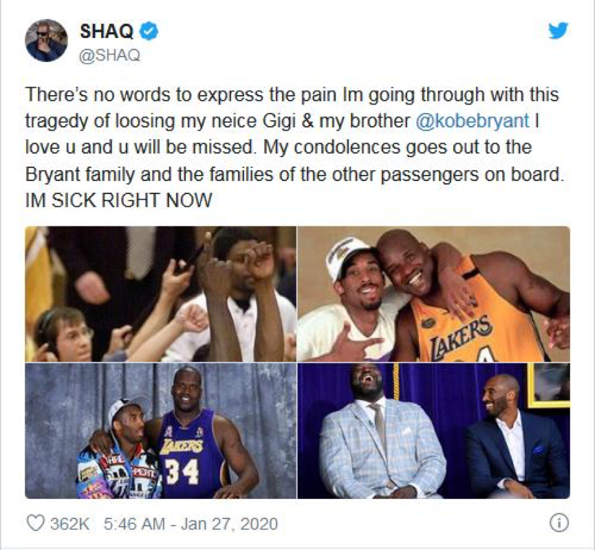 科比的前隊友、籃球名宿奧尼爾在社交平臺發文悼念
