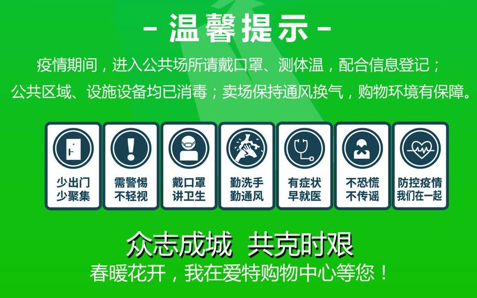 近日,衡水愛特購物中心在嚴格按照衡水市《商貿流通服務企業復市營業疫情防控實施方案》全面做好疫情防控及復市營業前期一切準備工作之后,決定于2月27日恢復正常營業。
