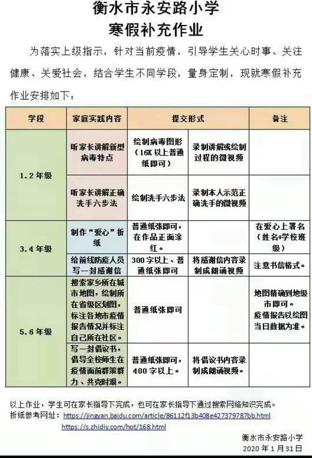 1月31日,衡水市永安路小學的學生家長們收到了學校給孩子們的一份“寒假補充作業”。