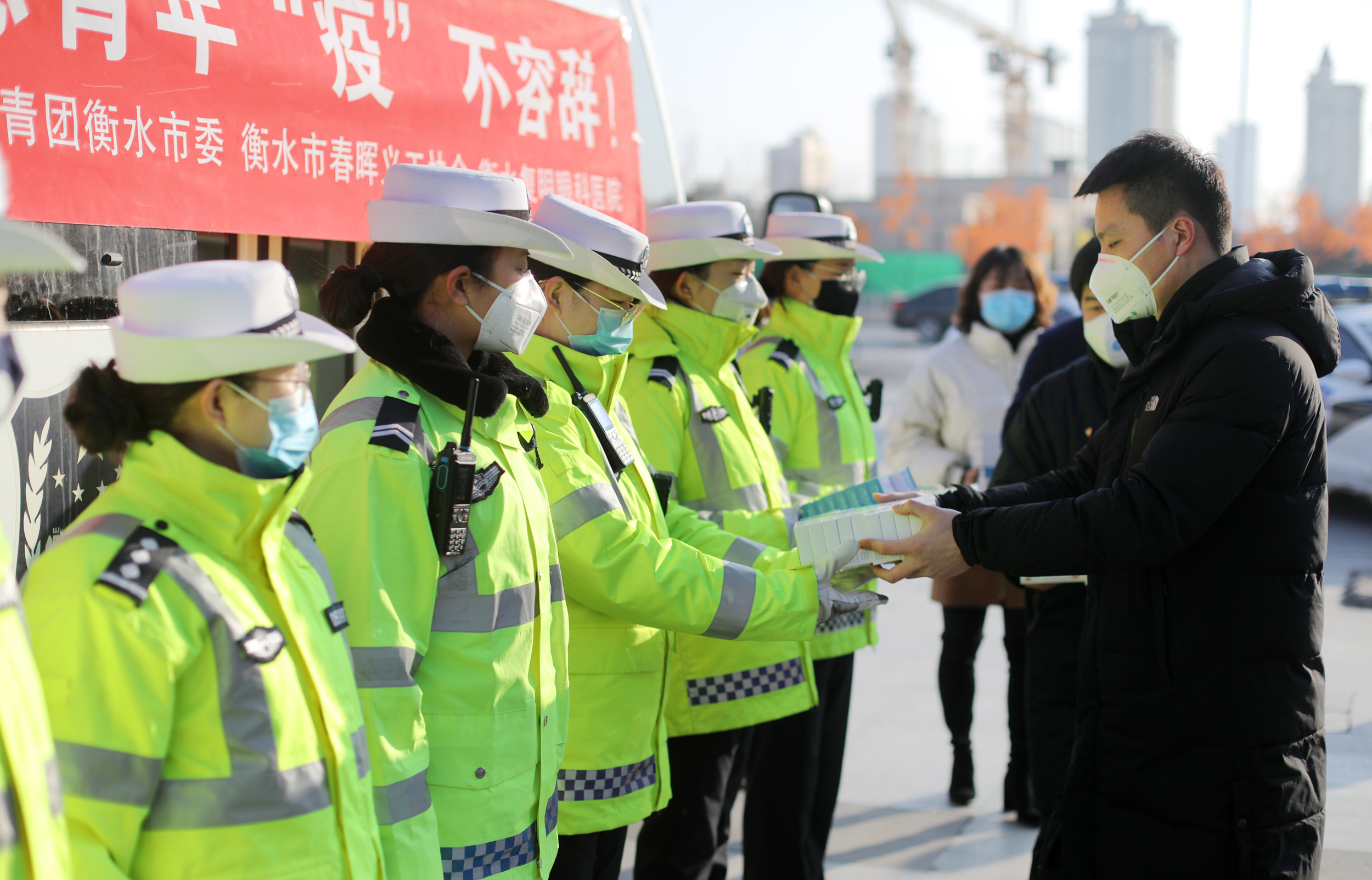 2月3日上午,共青團衡水市委工作人員為交警發放蓮花清瘟膠囊。