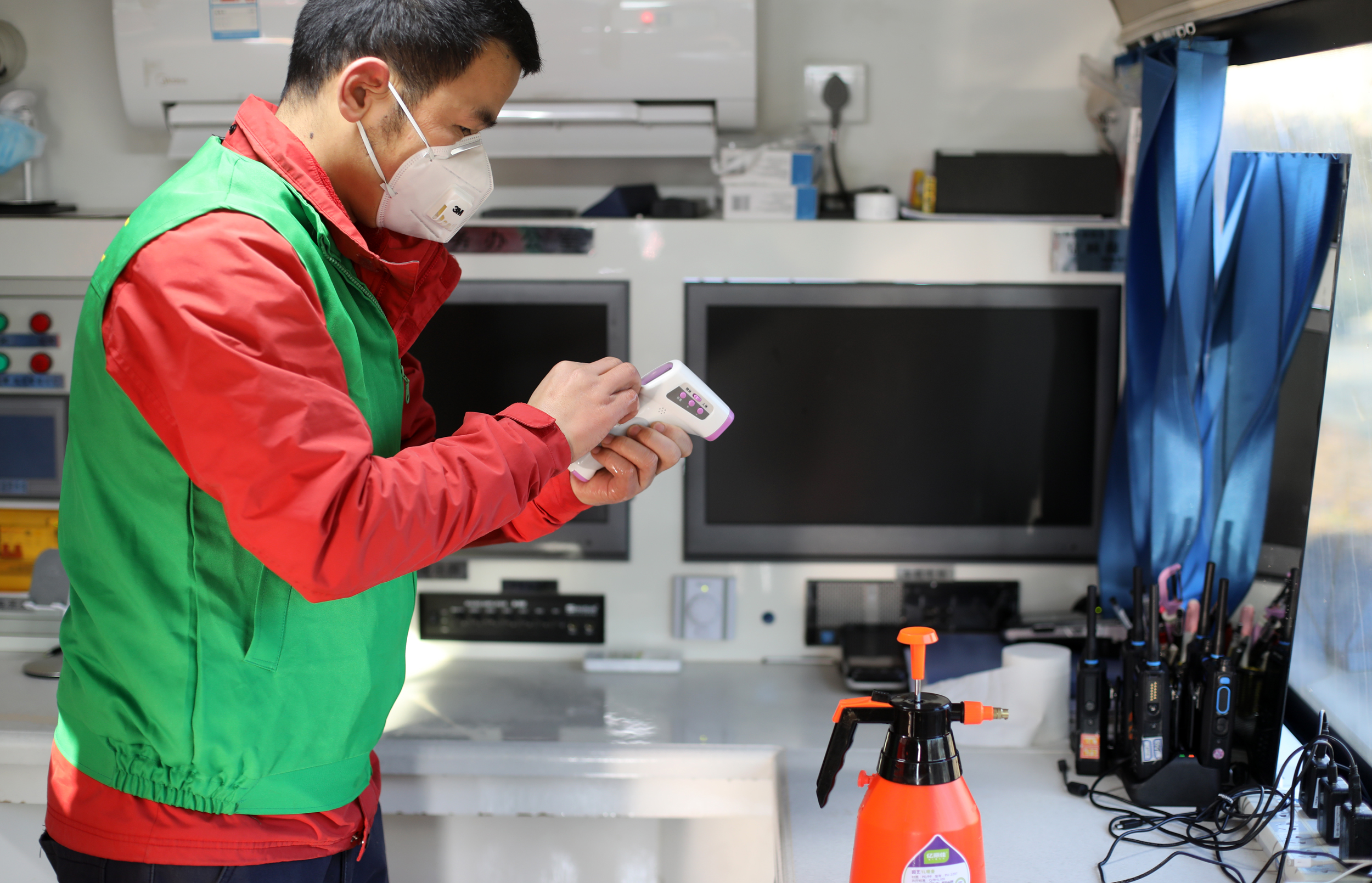 2月3日上午,春暉義工志愿者為交通崗亭消毒。