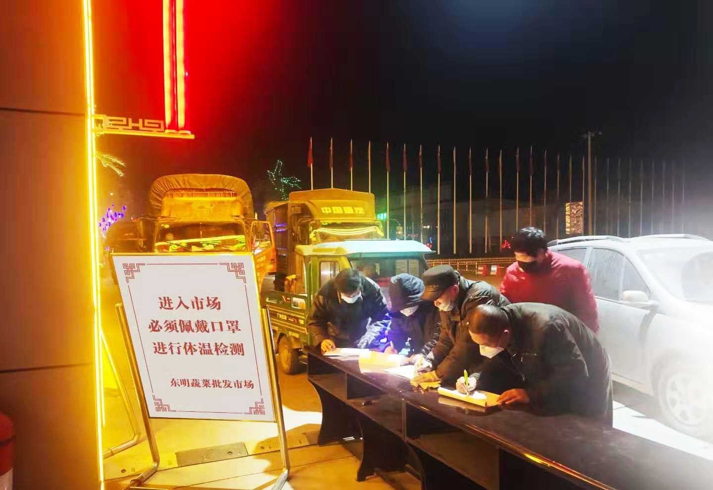 東明蔬菜果品批發(fā)市場(chǎng)對(duì)商戶(hù)進(jìn)行體溫檢測(cè)、登記