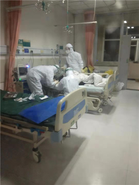肺四科病區是在4號樓第5層。隨著來隔離觀察的病人不斷增多,病區開始向下擴展,4層、3層相繼啟用,肺三、肺二、肺一科相繼把病房騰空,市三院不再區分科室,按梯隊分組,集結所有力量全力投入救治。
