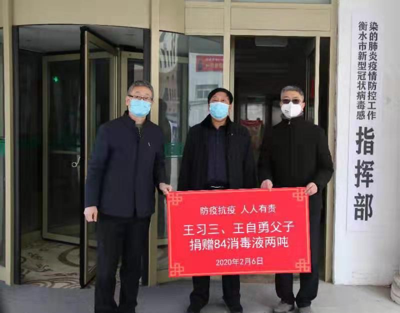 2月6日,王習三、王自勇父子向衡水市新型冠狀病毒感染的肺炎疫情防控工作指揮部捐贈了兩噸84消毒液,積極助力全市疫情防控工作。