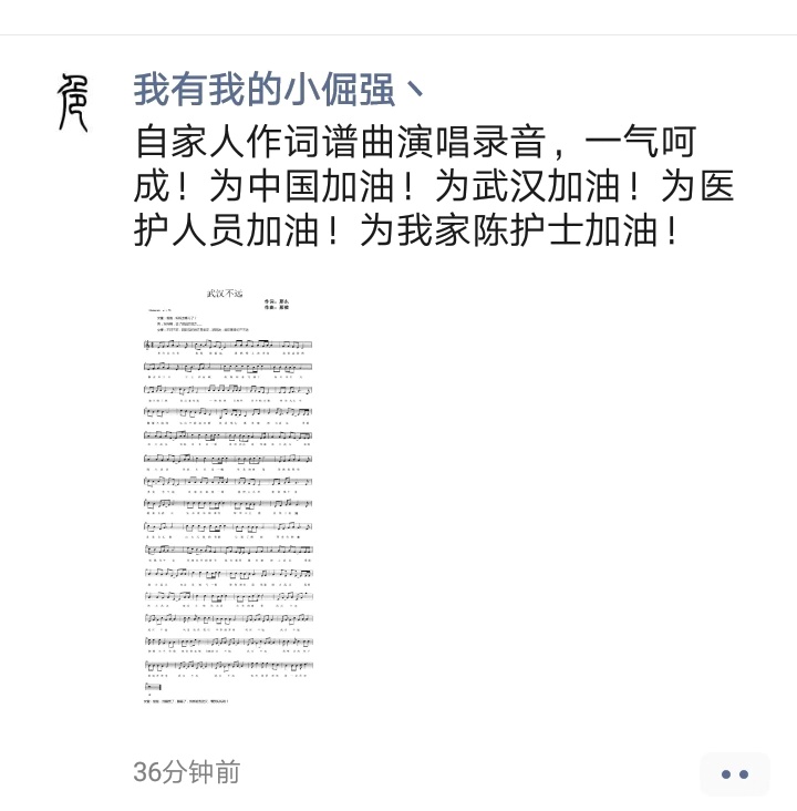 陳晶的表哥邢東,是衡水市一名優秀的文學撰稿人,新型冠狀病毒感染的肺炎疫情暴發后,看到全社會都積極行動起來,尤其是醫療人員奔赴湖北支援武漢,社會各界紛紛捐款捐物抗擊疫情的情形,邢東很受觸動,便提筆迅速創作了一篇題為《武漢不遠》的歌詞。“以前雖然寫了不少文章,但是從沒有寫過歌詞。”邢東說,寫完歌詞后,便想讓上大學的兒子邢楷為它譜上曲,但幾天來,邢楷總說欠缺一點靈感,始終沒有完成。