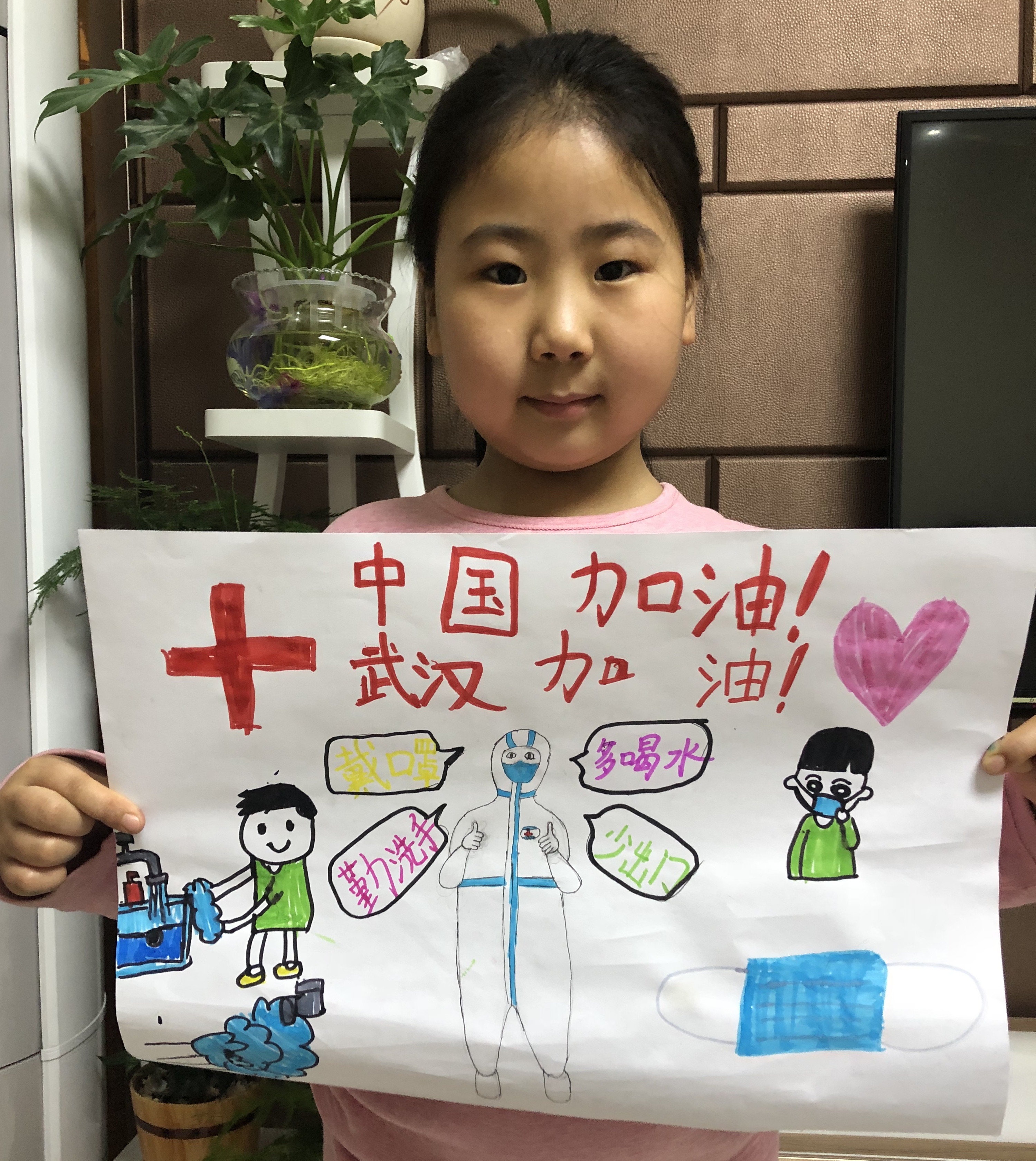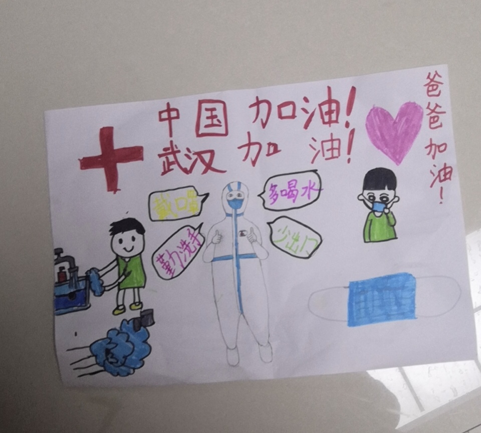 衡水市永興路小學二年級的吳世騰以爸爸為原型創作了一幅畫,畫中穿著隔離服的醫務人員就是吳建朝,她想對爸爸吳建朝說,“爸爸,加油!我等你平安歸來!”