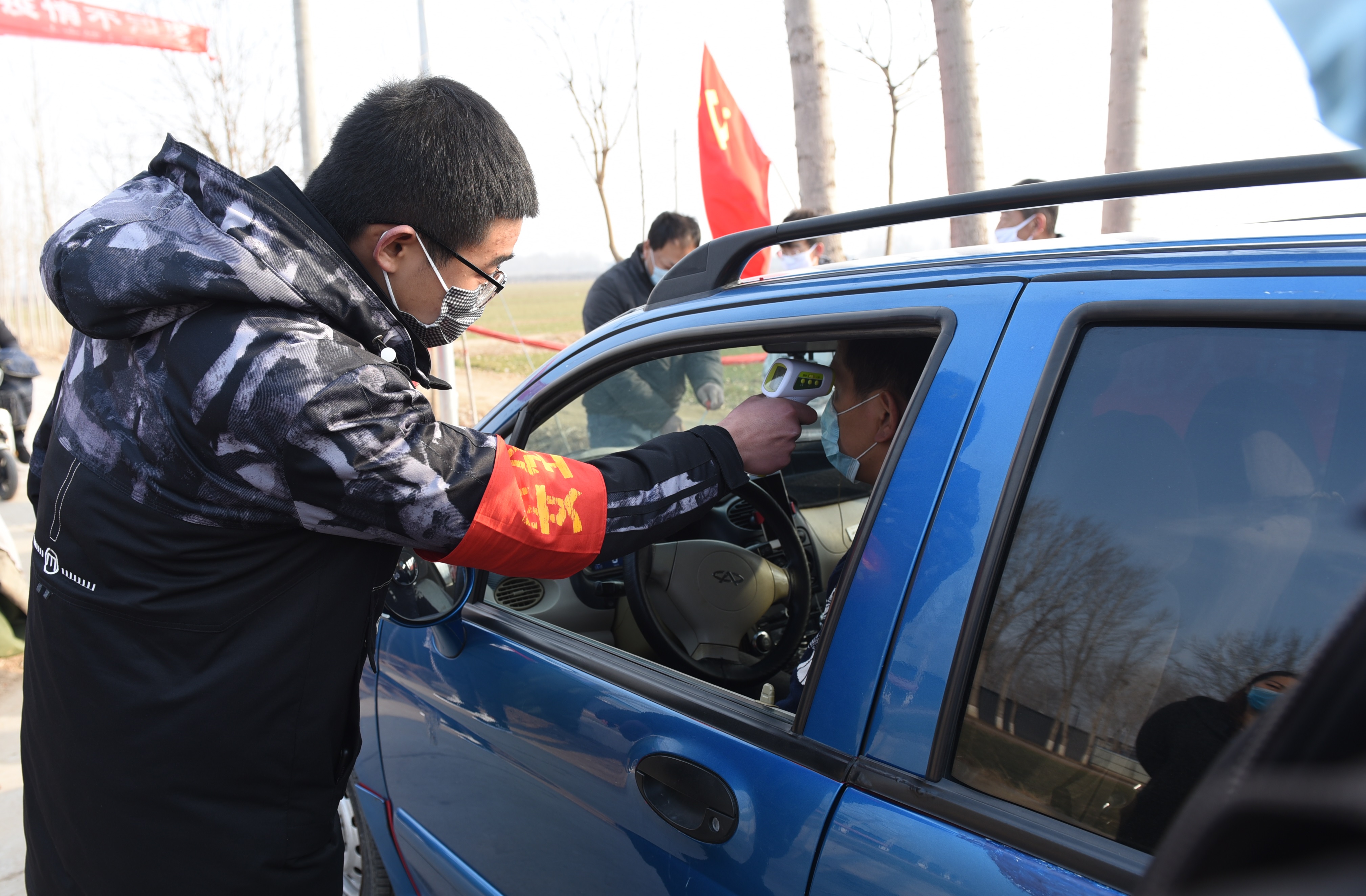 大屯鎮潘家村大學生志愿者為過往車輛司乘人員測量體溫。