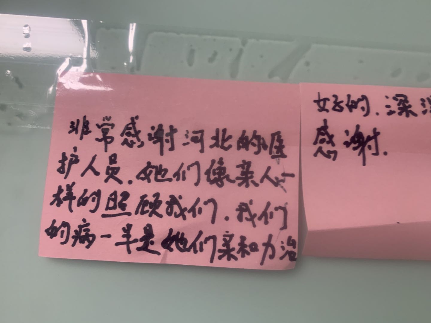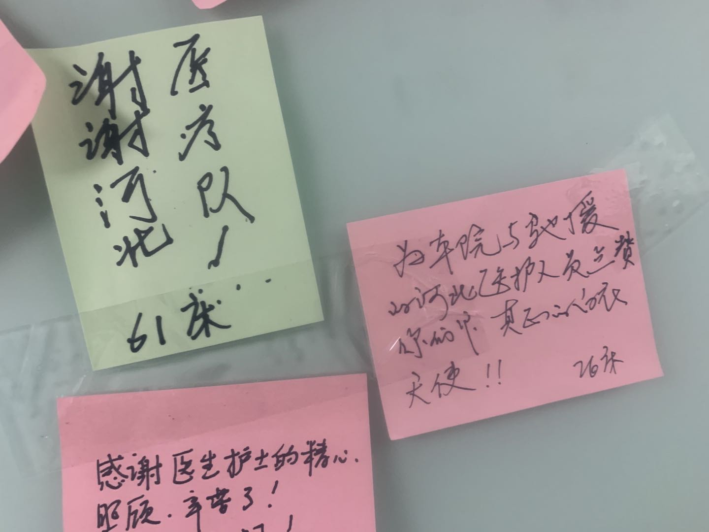 齊娜說,她最喜歡看的就是病區那面特殊的“留言墻”,墻上密密麻麻地貼滿了五顏六色的暖心卡片,卡片上是患者們手寫給醫護人員的感恩和祝福:“非常感謝河北的醫護隊員,他們像親人一樣地照顧我們。我們的病一半是他們的親和力治好的。深深地感謝!”“感謝醫生護士的精心照顧,你們辛苦了!”“為本院與馳援的河北醫護人員點贊,你們是真正的白衣天使。”每次看到這些暖心的卡片,齊娜的心中都會充滿無限的力量。她說,這些卡片的背后,是他們與患者之間逐漸建立的深厚感情。其實,像這樣醫患情深的故事每天都在武漢上演。