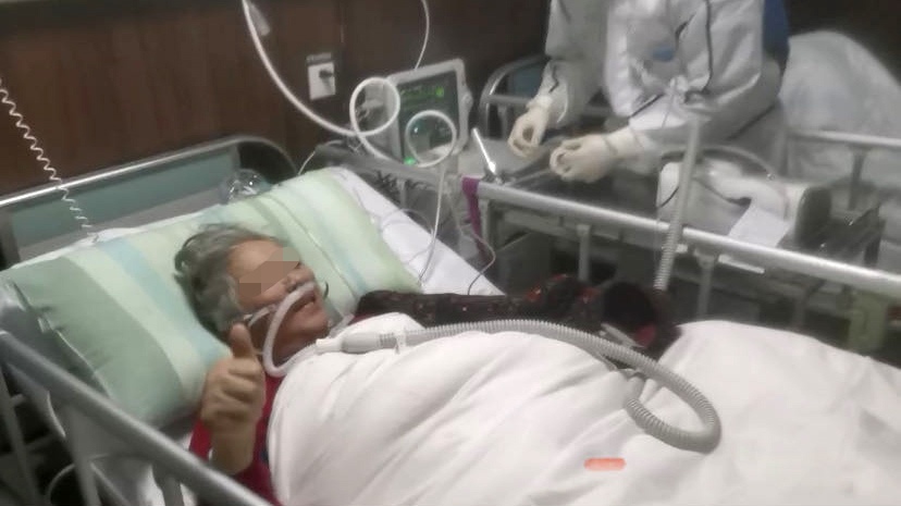 一位老年患者病情比較重,入院后一直戴著無創呼吸機,齊娜給她更換了經鼻高流量,這個儀器沒有無創呼吸機面罩對面部的壓迫,比較舒適,也能提供高濃度氧。患者不斷地表達著感謝,向她伸出拇指說:“我是共產黨員,我愛我的國家,我愛我的黨,我更愛你們,希望你們平安回家”。患者的話語字字落入齊娜的心里,讓她充滿了動力。