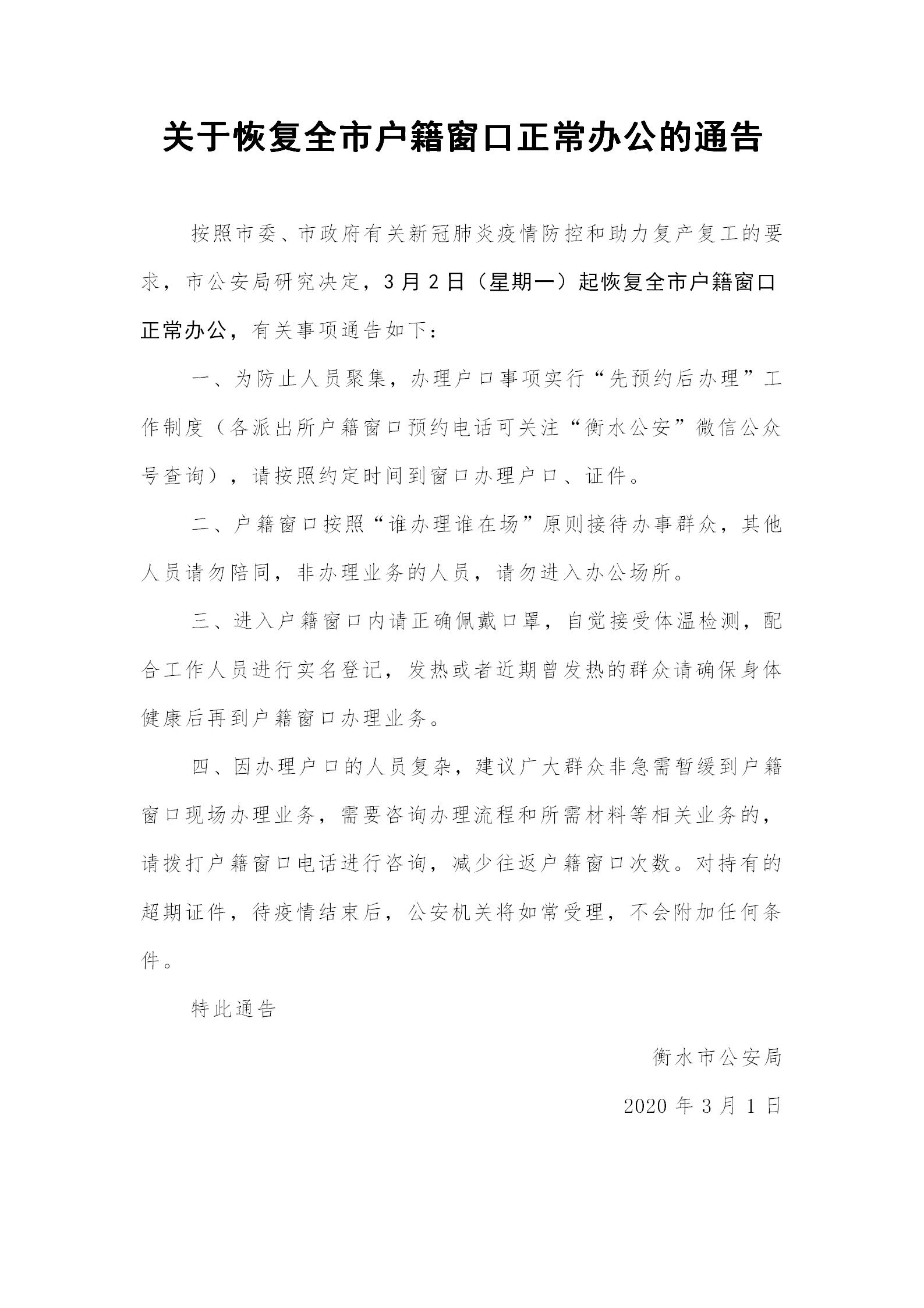 一、為防止人員聚集,辦理戶口事項實行“先預約后辦理”工作制度(各派出所戶籍窗口預約電話可關注“衡水公安”微信公眾號查詢),請按照約定時間到窗口辦理戶口、證件。