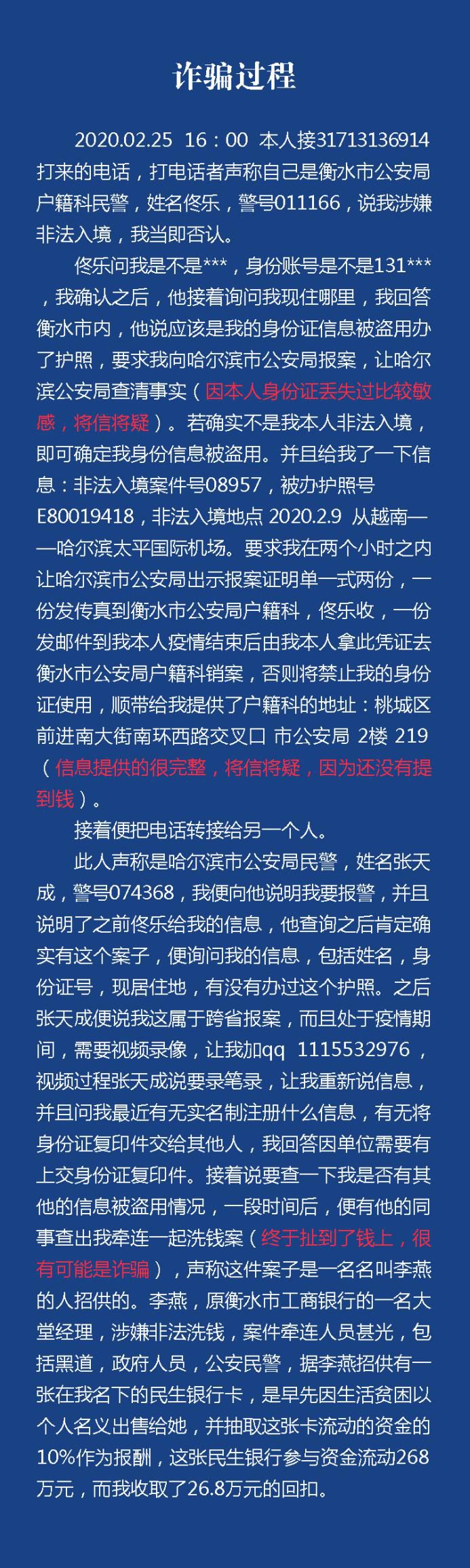 這是我市反詐中心發(fā)出的一份《緊急預警》,就在這份預警發(fā)布的第二天,也就是2月25日,市區(qū)王女士又接到了一通“衡水戶籍民警”打來的電話,憑借自身高度的警惕性和冷靜判斷,王女士最終沒有上當。“我要把自己經(jīng)歷的詐騙過程完完整整講述出來,就當是給大家提個醒吧!”