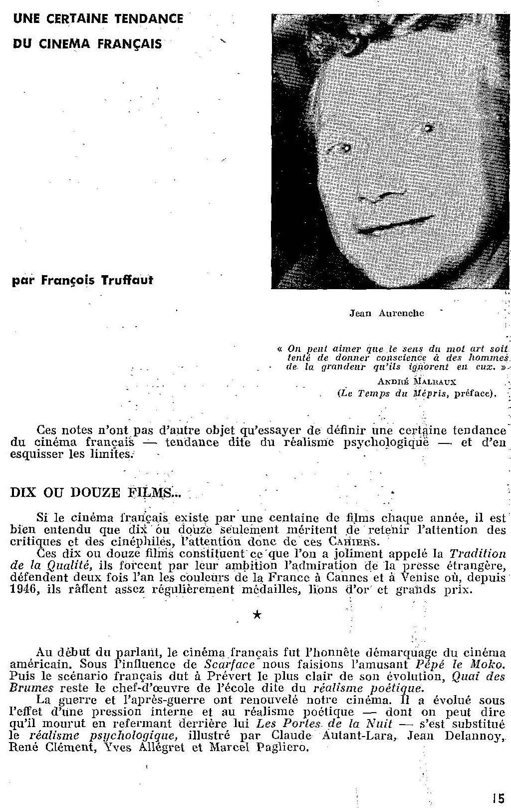 值得注意的是,在這次請辭的聲明中,編輯們引用了前輩特呂弗發(fā)表于1954年的《論法國電影的某種傾向》一文。這篇文章曾狠批當時迎合好萊塢口味的所謂“法國優(yōu)質電影”,認為它們陳腐老舊,毫無創(chuàng)新。這篇文章,曾經敲響了“法國新浪潮”電影運動反叛的鐘聲。