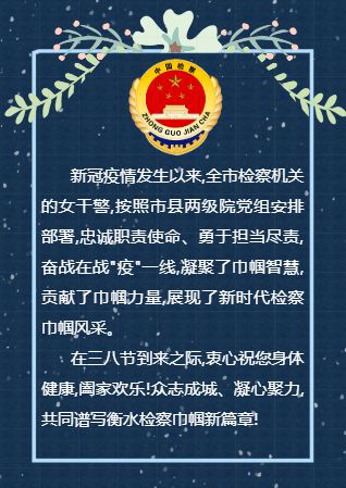 新冠疫情發(fā)生以來,全市檢察機(jī)關(guān)的女干警忠誠職責(zé)使命、勇于擔(dān)當(dāng)盡責(zé),奮戰(zhàn)在戰(zhàn)“疫”一線,凝聚了巾幗智慧,貢獻(xiàn)了巾幗力量,展現(xiàn)了新時(shí)代檢察巾幗風(fēng)采。在今年三八節(jié)衷心祝大家:身體健康、闔家歡樂!眾志成城、凝心聚力,共同譜寫衡水檢察巾幗新篇章!