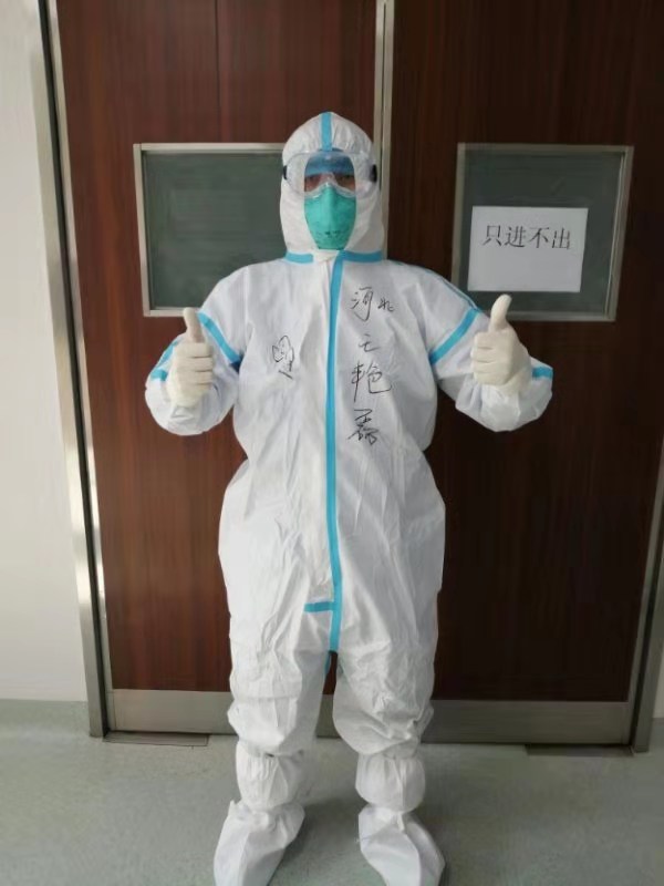 在武漢金銀灘醫院里,衡水市四院護士郭文昊除了基本的醫療工作外,還要為患者喂水喂飯,被他感動的患者們紛紛在他的防護服上寫下名字。