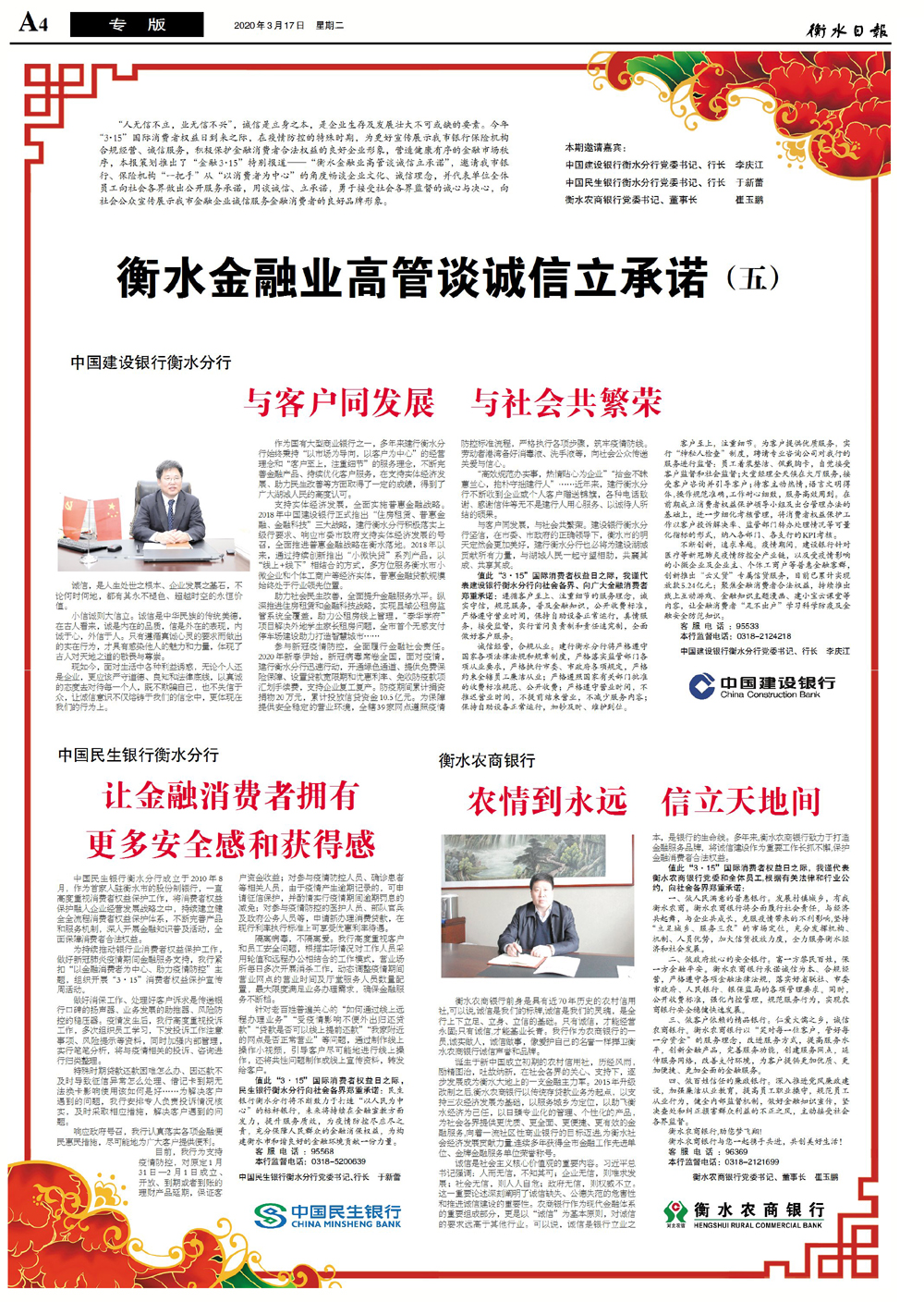 值此“3·15”國際消費者權益日之際,我謹代表衡水農商銀行黨委和全體員工,根據有關法律和行業公約,向社會各界鄭重承諾: