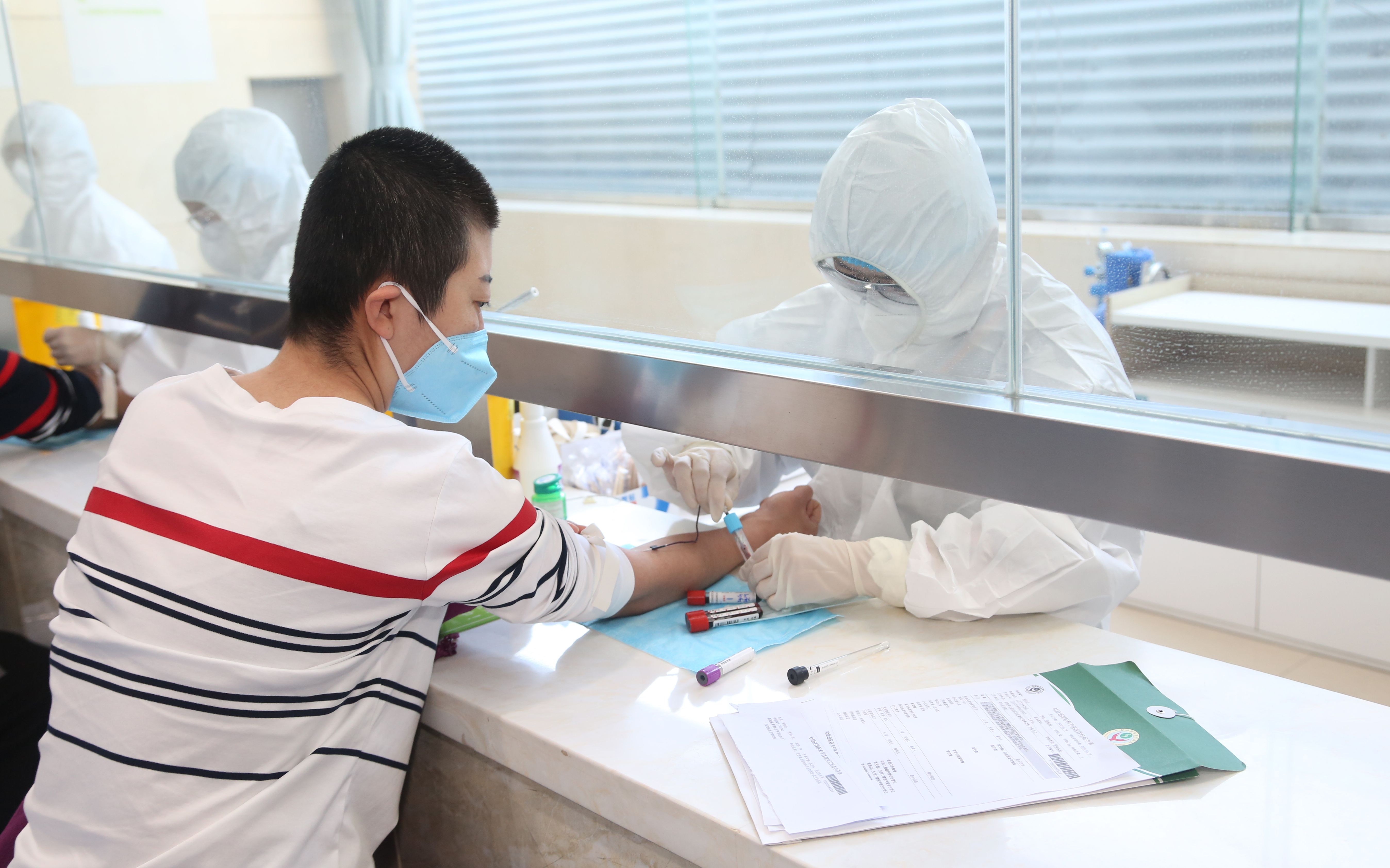 排隊測量體溫后,隊員們進入明亮的體檢大廳。工作人員將寫有每個人名字的體檢袋發放到隊員手中。袋子中,明白紙上清晰地寫著體檢流程、各項目體檢位置、體檢須知等。體檢中心還安排了導診人員引導隊員們體檢。