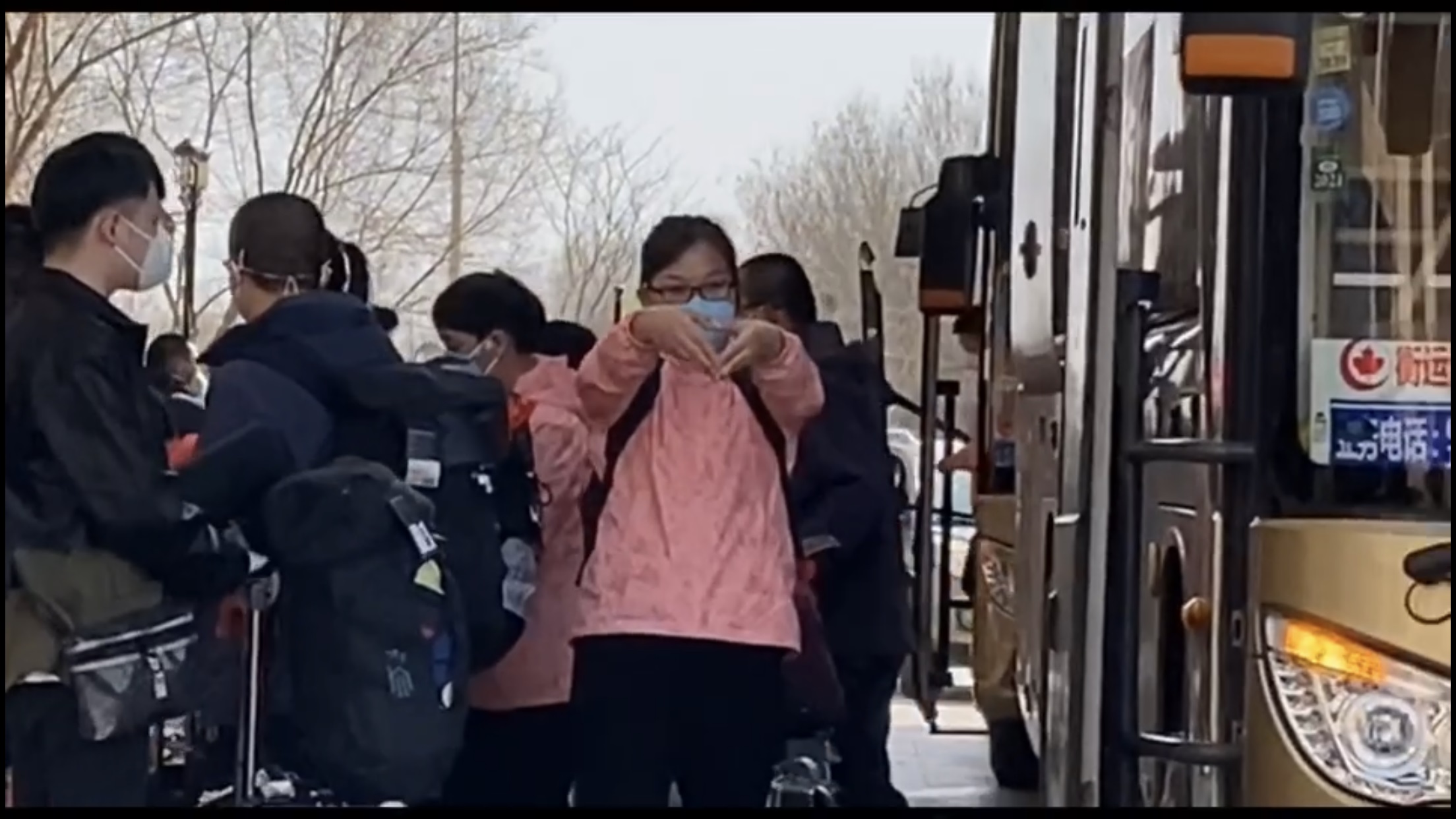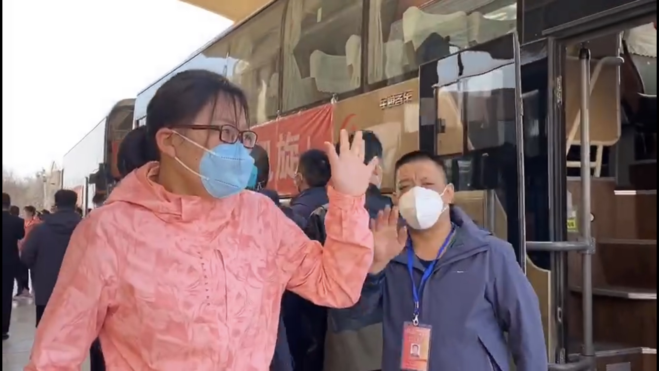當天14時40分許,車隊緩緩駛入酒店,危世寧一手抱著兒子,一手指著大巴車說:“看,媽媽回來了,媽媽就在車上!”孩子順著他指的方向望去,大聲喊著:“媽媽,媽媽……”許是母子連心的緣故,從大巴車上一下來,陳晶就聽到了兒子的呼喊,她趕忙四處張望,終于看到遠處正朝她揮手呼喊的家人,“哎,你們怎么來啦!”終是思念家人,一見到他們,陳晶的眼淚在眼眶里打起了轉,“回去吧!我過一陣兒就回家了!我挺好的,你們放心吧!”陳晶朝著家人用雙手比了一個心形。那邊,看到了妻子的身影,危世寧抱著兒子往前走了幾步,兒子依然不停地呼喊著:“媽媽,我們在家等你!”