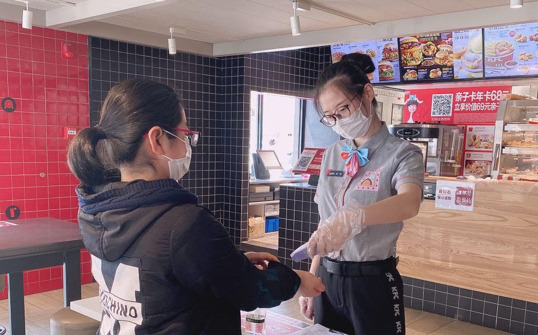 現(xiàn)在,肯德基餐廳已經(jīng)開放堂食,樊勃高興地看到,顧客一天比一天多了起來。她說:“我們有嚴(yán)格的防疫措施,員工每天測量體溫,嚴(yán)格執(zhí)行各項消毒制度。每一位來就餐的顧客都要測體溫,并登記個人信息。我們專門在柜臺前設(shè)立了取餐處,顧客不能靠近柜臺,可以手機(jī)自助下單后到取餐處取餐,以保證每一份餐食都安全衛(wèi)生,就餐的顧客也會盡量隔開距離坐,顧客們可以放心來我們餐廳就餐。”