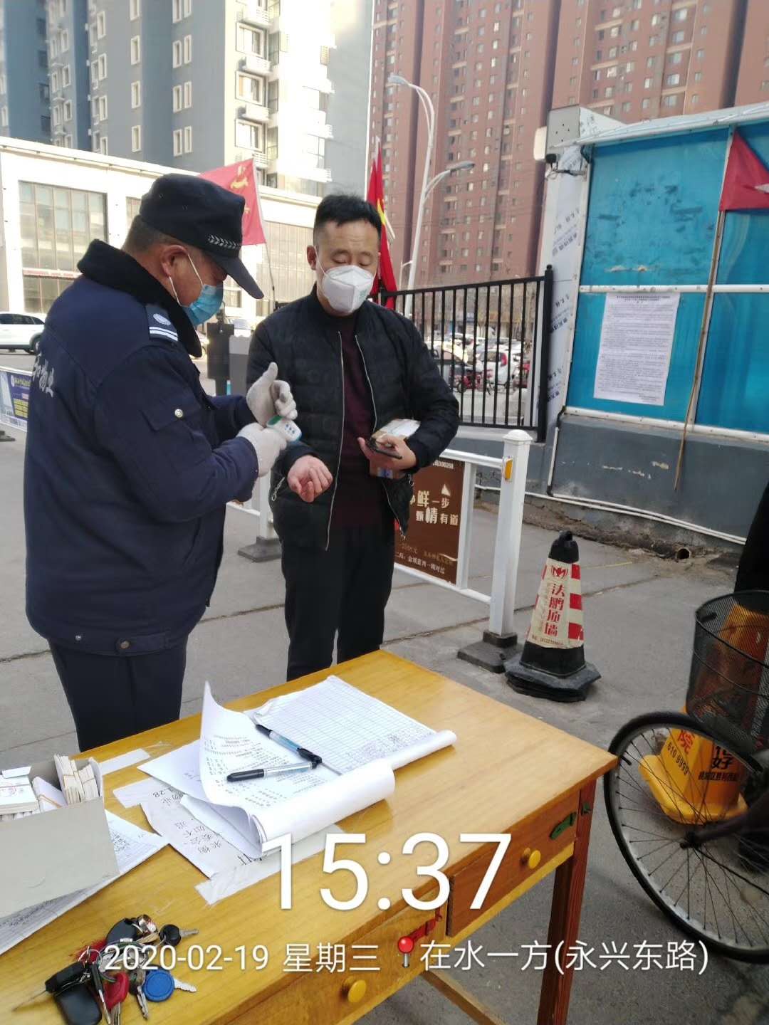 在水一方物業員工對進入小區人員認真測量體溫