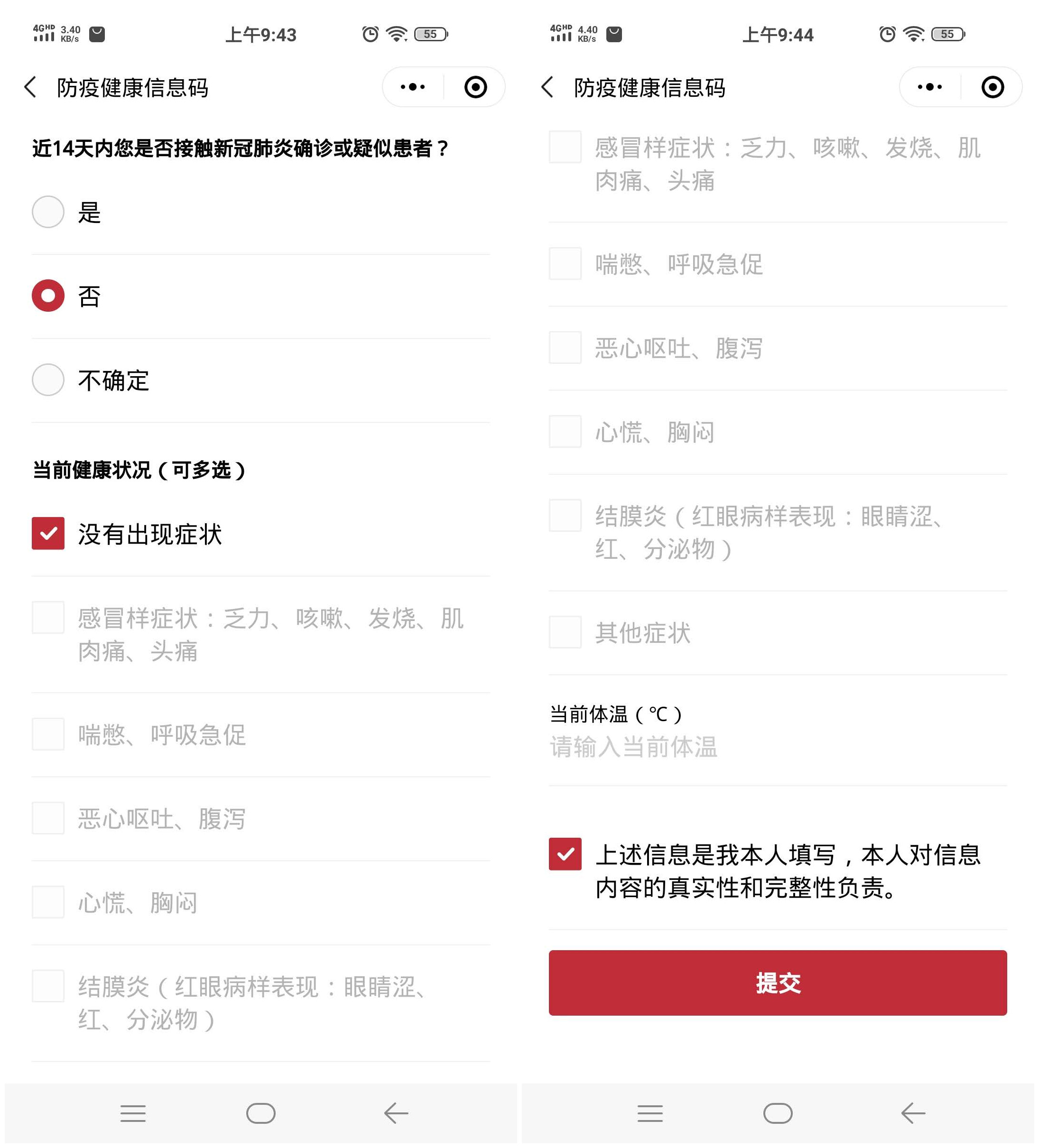 目前,我省“健康通行碼”按用途分為“出示碼”和“掃描碼”兩種,依據個人防疫健康風險分級,分為紅、黃、綠三種顏色,供各類機關、企事業單位和疫情防控卡口使用。按規定,“紅碼”和“黃碼”人員不能通行,且應按照疫情防控部門要求進行醫學診療或觀察;“綠碼”人員體溫正常的可予以通行。比如,市民在準備進入超市時,可通過“出示碼”功能,在超市入口向工作人員展示自己的健康狀況;同時,超市工作人員可通過“掃描碼”功能,獲取每一位顧客的防疫健康信息,快速判斷顧客是否符合出入要求。
