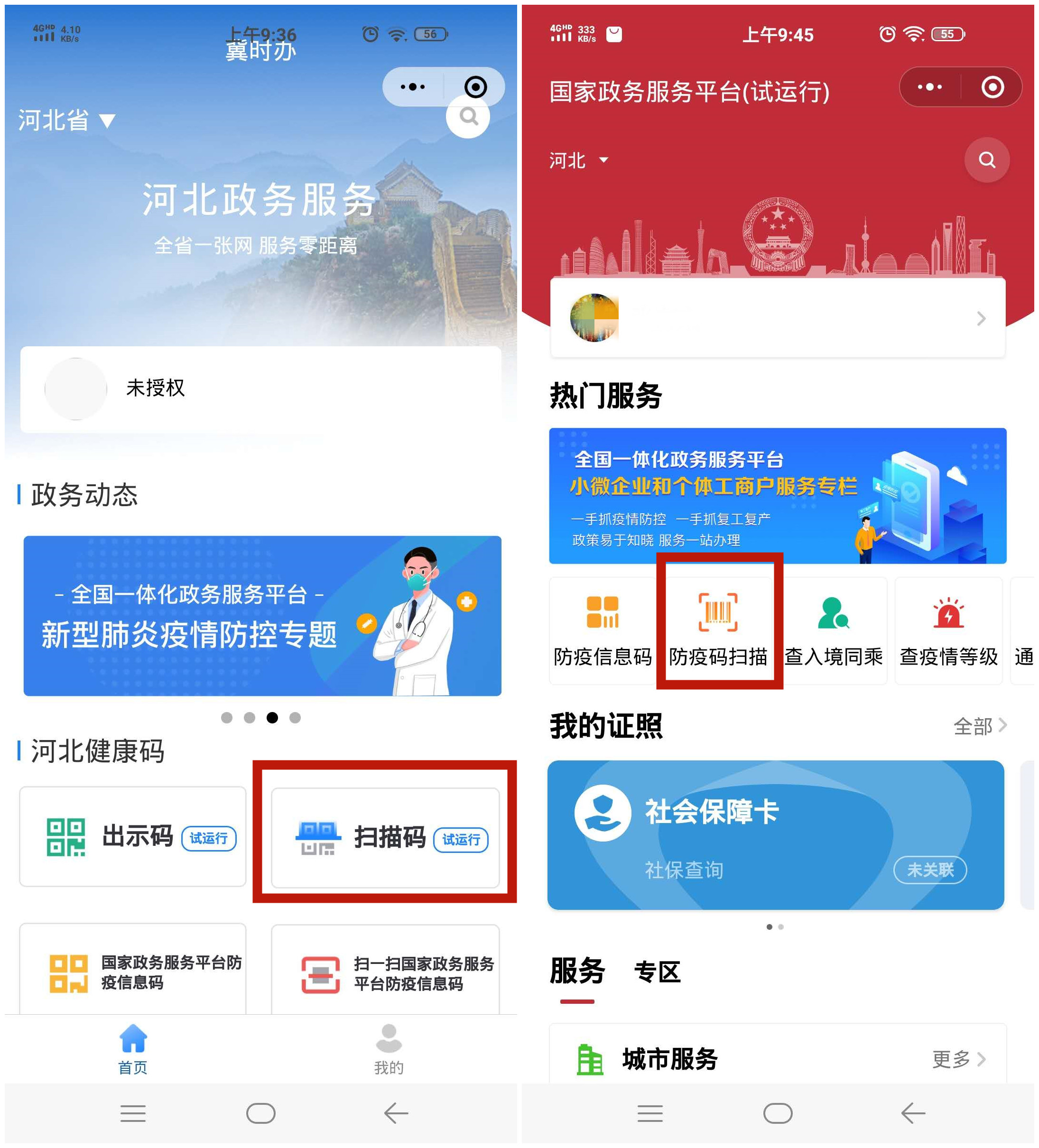 使用“掃描碼”的具體步驟為:打開微信/支付寶,搜索“冀時辦”-選擇“冀時辦”小程序,按提示進行授權登錄-點擊“河北通行碼”欄目下的“掃描碼”-跳轉到“國家政務服務平臺”小程序登錄授權-點擊“熱門服務”下的“防疫碼掃描”-掃描他人出示的健康通行碼—系統即顯示該人員健康通行碼信息。