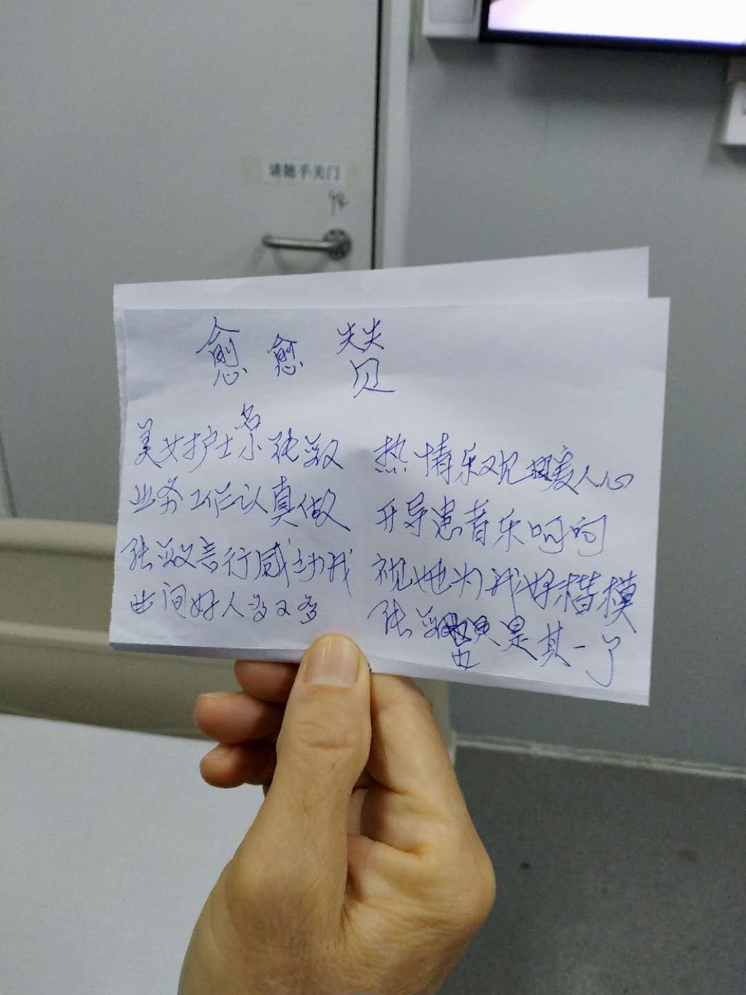 在練習的過程中張敏不斷鼓勵著老大爺,工作間隙還會主動陪他說說話。在陪伴和鼓勵的過程中,張敏的真誠活潑感染了大爺,大爺逐漸樂觀了起來,病也逐漸好了起來。出院的時候,老大爺說:“謝謝你啊,小敏,你的熱情樂觀溫暖了我的心,使我又重建了戰(zhàn)勝疾病的信心!”大爺專門為她寫了一首贊美詩:“美女護士小張敏,熱情樂觀暖人心;業(yè)務工作認真做,開導患者樂呵呵。”拿到這首詩,張敏還有些不好意思:“這是他的有感而發(fā),其實真沒想到老大爺那么喜歡我,我只是做了應該做的。我們來武漢的目的不只是救治患者,還要把樂觀向上的精神傳給患者。”