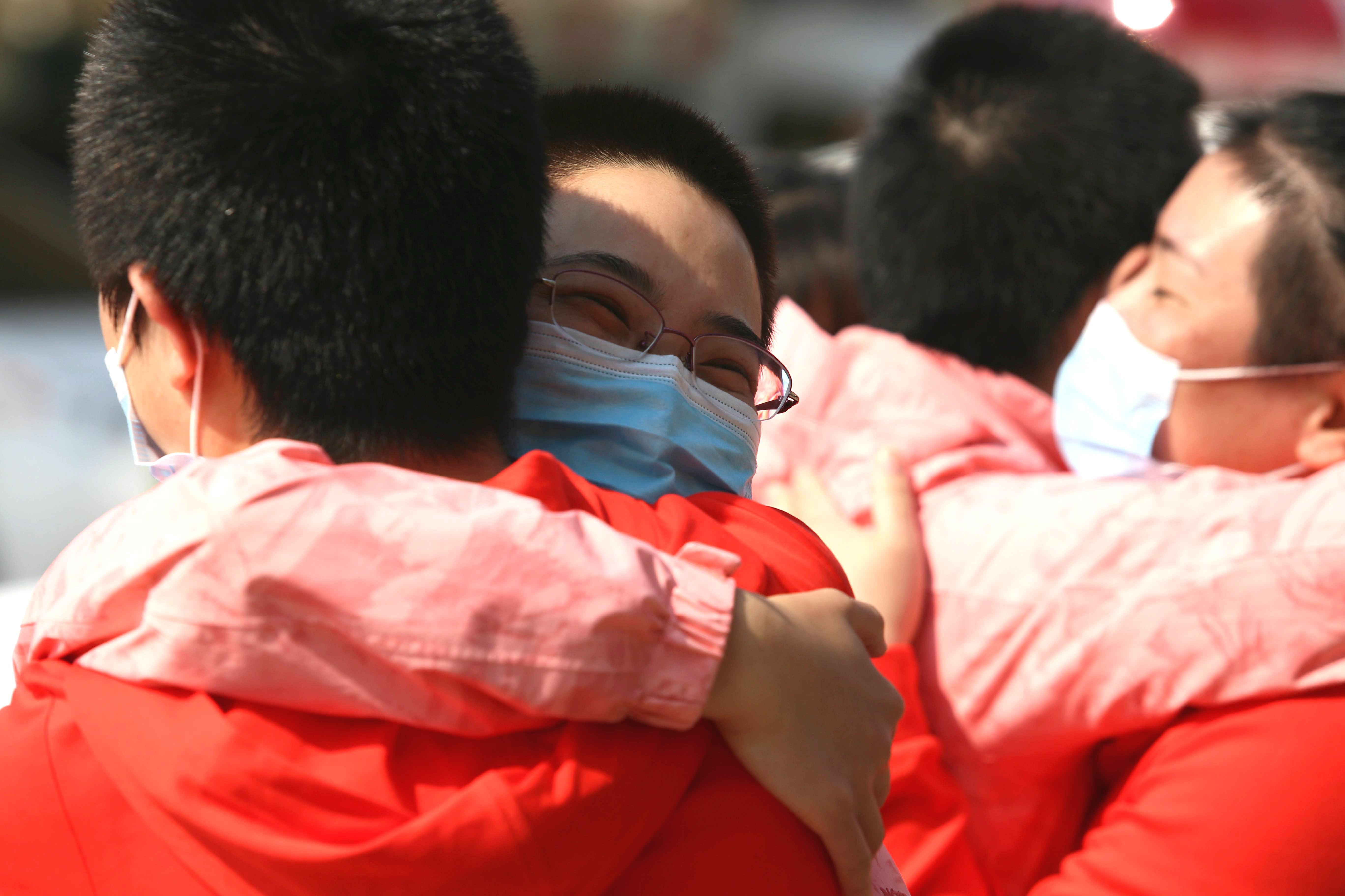 數(shù)十天的并肩戰(zhàn)斗,衡水支援湖北醫(yī)療隊的隊員們早已結(jié)下了深厚友誼。縱有千般不舍,終將離別。隊員們拎著行李緩緩走出酒店大門,不停地向同伴揮手作別,有的已經(jīng)熱淚盈眶,“再見了,我會想你們的!”“咱們明年一起在櫻花樹下暢游吧!”“等疫情過去了,我們定要好好地喝一杯!”……一句句不舍的道別、一個個緊緊的擁抱,這段特殊的戰(zhàn)“疫”經(jīng)歷和“過命”的戰(zhàn)友情,隊員們必定銘記一生。“之前我們聊天的時候,就說看看分別的時候誰會第一個落淚,沒想到大家?guī)缀跬瑫r控制不住了!”衡水市六院急診科護士李森,不停地向同伴們揮手,他說,之前他為隊員們拍了很多視頻,以后這些視頻畫面將會成為他最美的回憶。