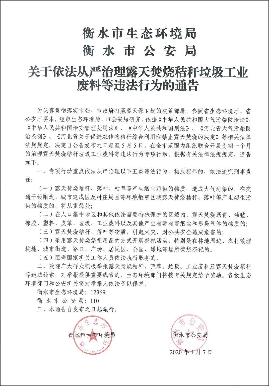 4月7日,市生態環境局、市公安局聯合發布《關于依法從嚴治理露天焚燒秸稈垃圾工業廢料等違法行為的通告》,通告決定,在全市范圍內組織聯合開展為期一個月的治理露天焚燒秸稈垃圾工業廢料等違法行為專項行動。