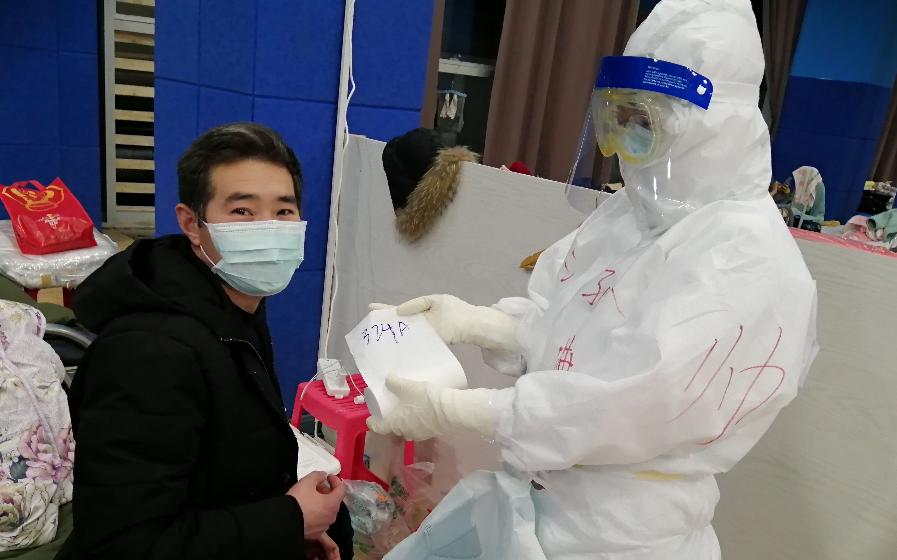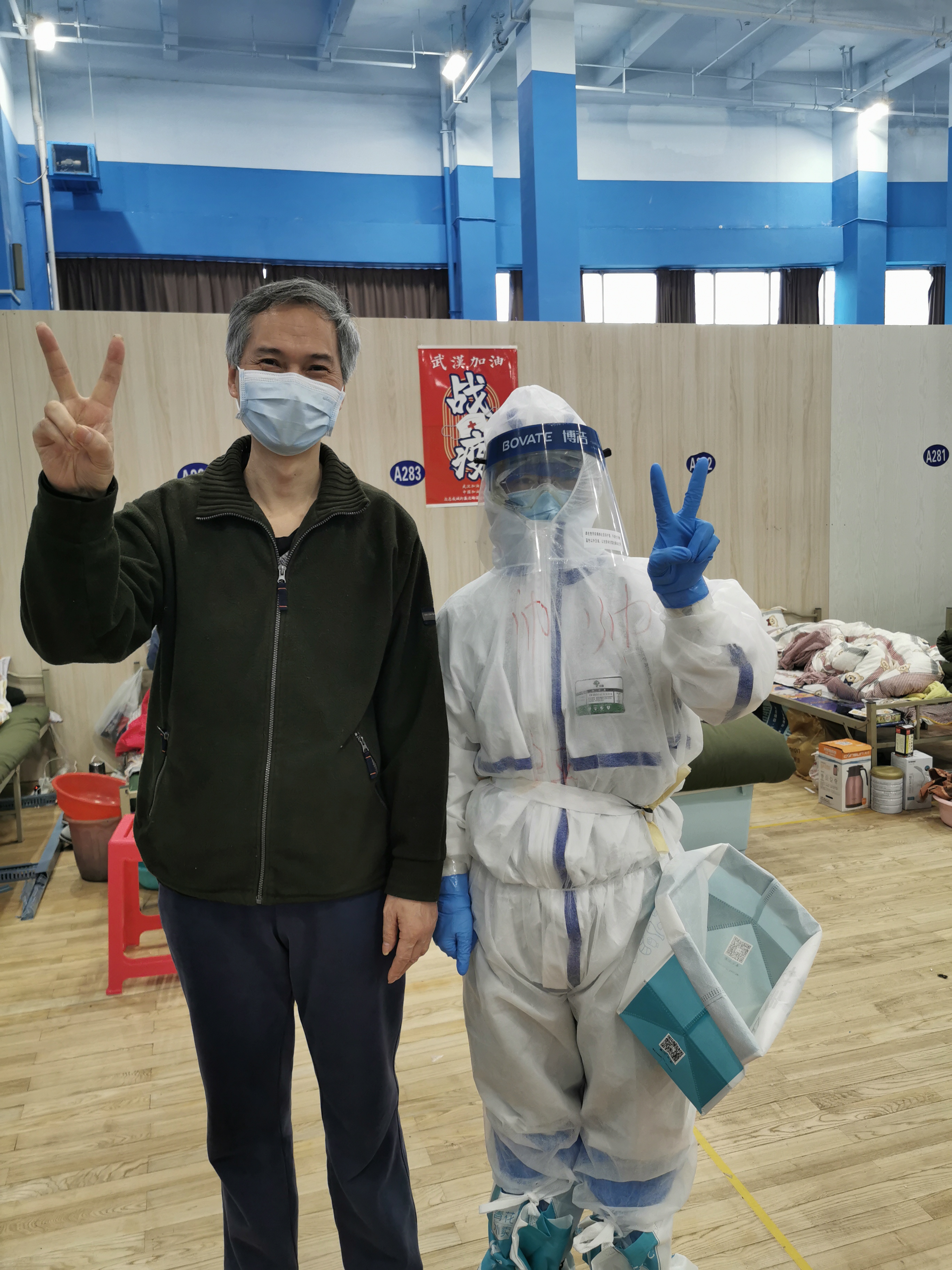 經過專業的培訓,12日凌晨,我們正式入駐武漢江岸方艙醫院,隊友們彼此互相鼓勵和確認防護是否做到萬無一失。艙里空氣流通差,防護服又悶又熱,6個小時下來,大家都有一種虛脫的感覺,有的隊員癱坐在地上起不來,我自己也汗流浹背,而且一度懷疑防護服也破了,回酒店路上,30分鐘的車程,我足足睡了30分鐘。
