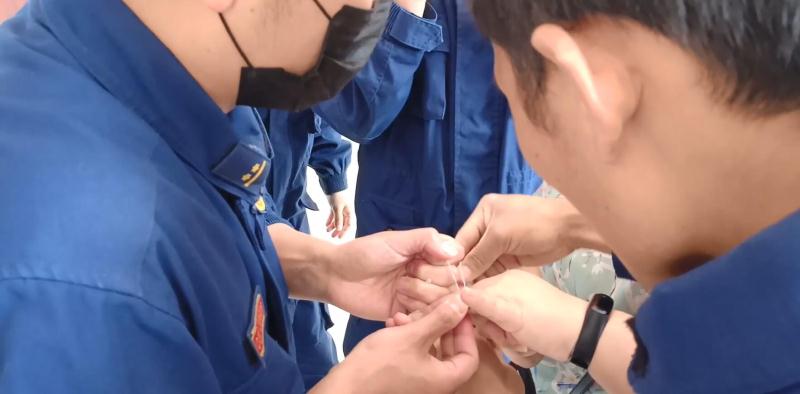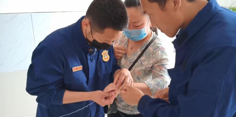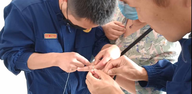 當日下午14時,衡水市高新技術產業開發區冀衡路消防救援站的大門口來了一名神態焦急的女子,值班隊員發現后,立即上前詢問,原來,因為試戴戒指導致戒指卡在手指,女子想盡了辦法也取不下來,只好到消防站來求助。正在訓練的隊員們聞訊立即趕來查看,只見女子左手無名指上套著一個銀色戒指,戒指卡在手指底端,手指2、3節腫脹嚴重。看到此情況后,救援人員立即拿來細線和香皂,先用香皂將手指潤滑,然后用細線穿過指環,最后采用指頭端纏線、指根端解線的方式,一點一點的將戒指向外移動。經過約8分鐘的救援,戒指被成功取下。在表達感謝后,女子神態輕松的離開了冀衡路消防救援站。