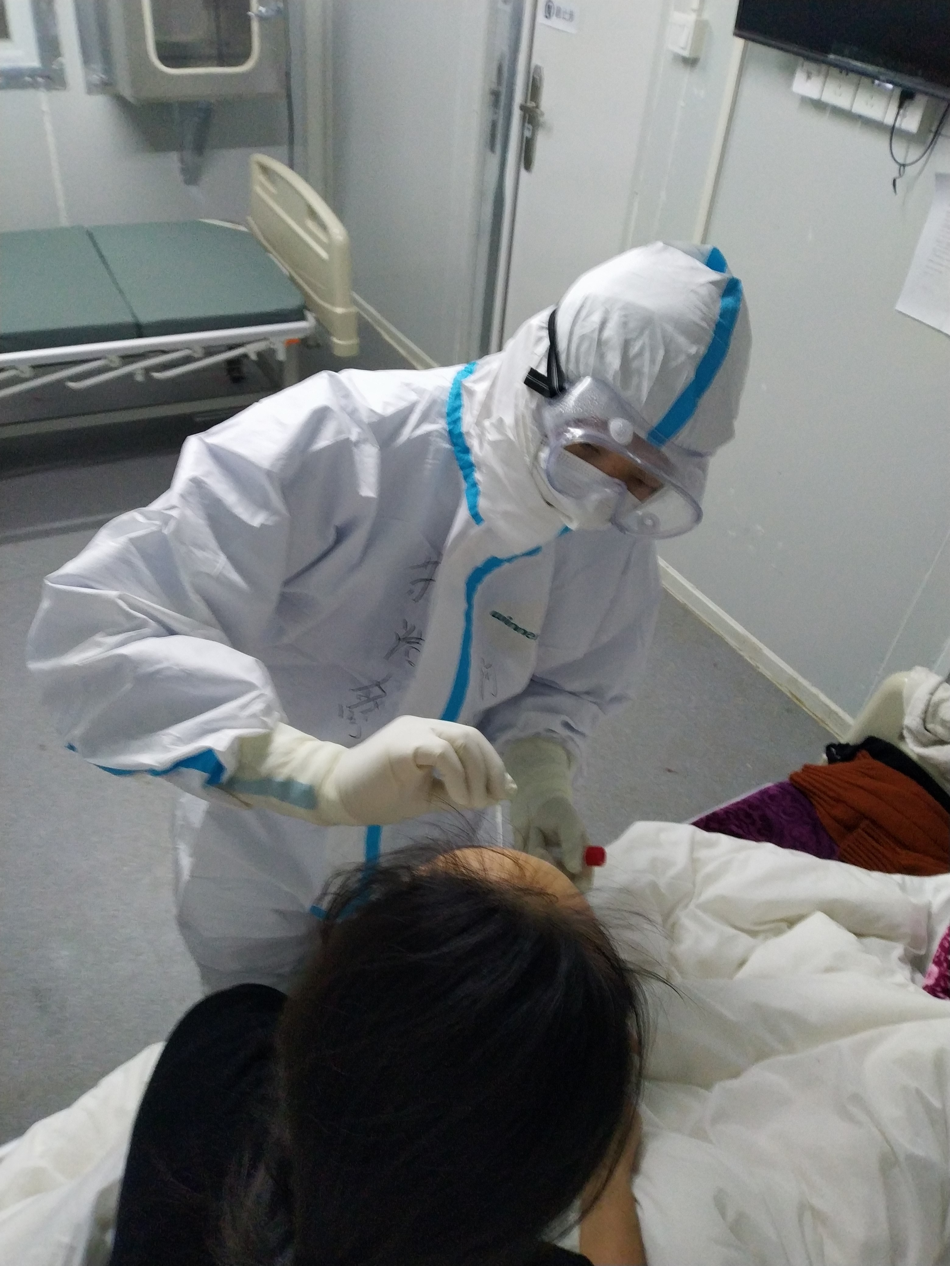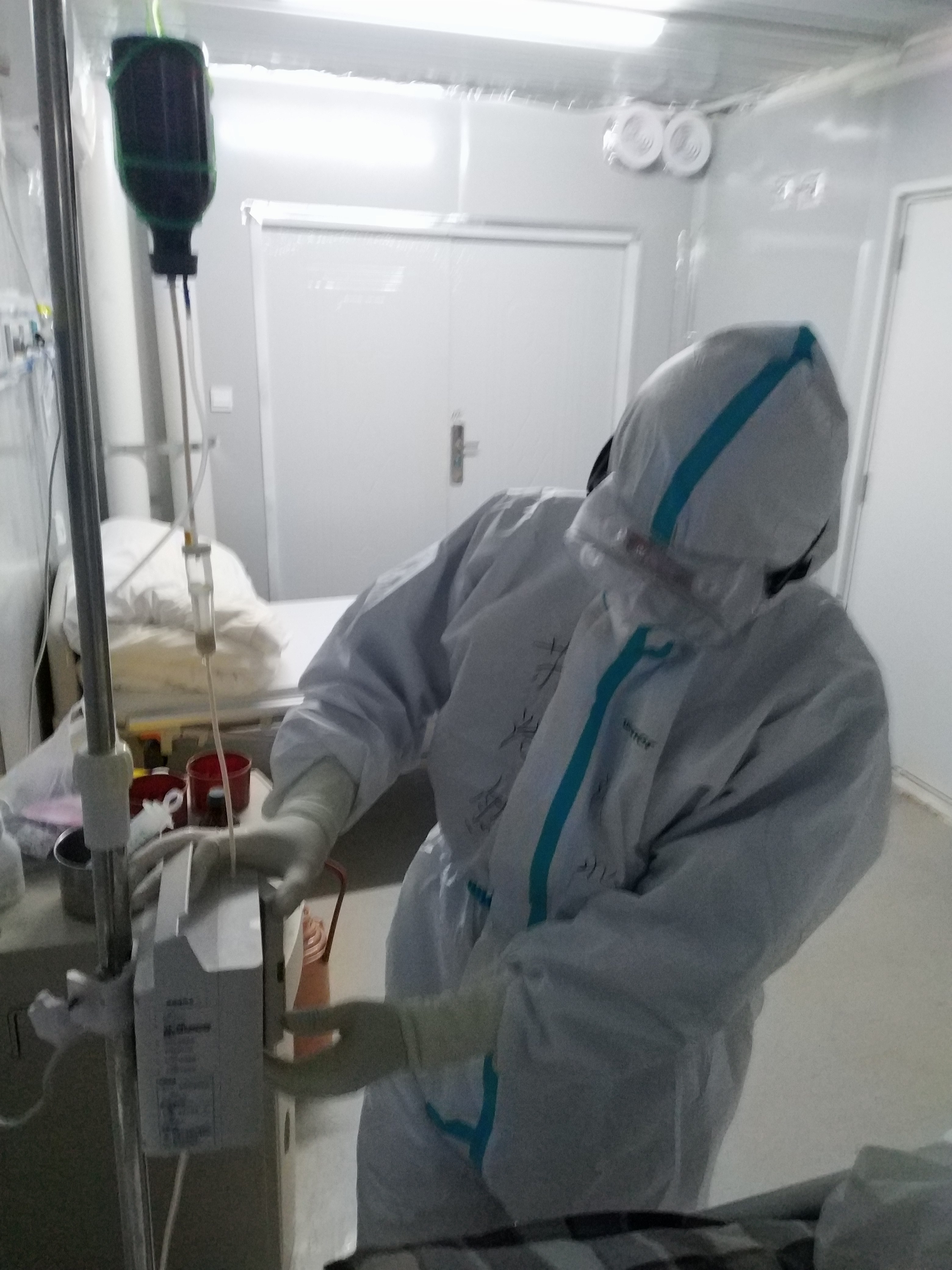 我被先后分配到武漢大學中南醫院和雷神山醫院進行護理工作。 作為一名醫護人員,只有過硬的技術才能是做好護理工作的前提。一次給一位意識模糊的老年患者采集動脈血氣分析,這項在平時很簡單的操作,忽然成了很大的挑戰。模糊的護目鏡,三層手套的干擾,沒有真正阻止我。憑借多年重癥護理經驗,我一針見血采集成功。