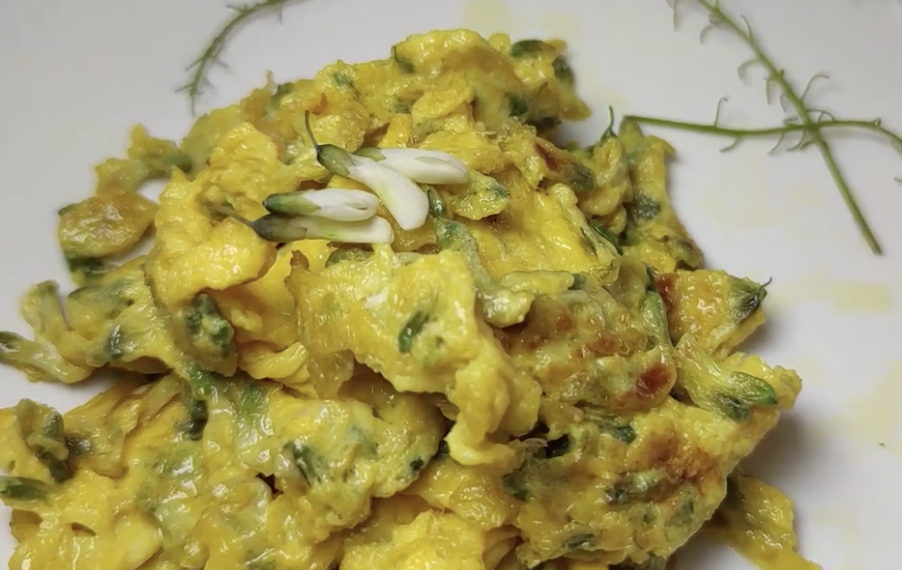 槐花炒雞蛋是北方地區很普遍的一道家常菜。做法比較簡單,將新鮮的槐花焯水和雞蛋一起炒。槐花雞蛋吃起來有一股淡淡的槐花香味,也有人將它和香椿炒雞蛋并列為“春天最香的炒雞蛋”。