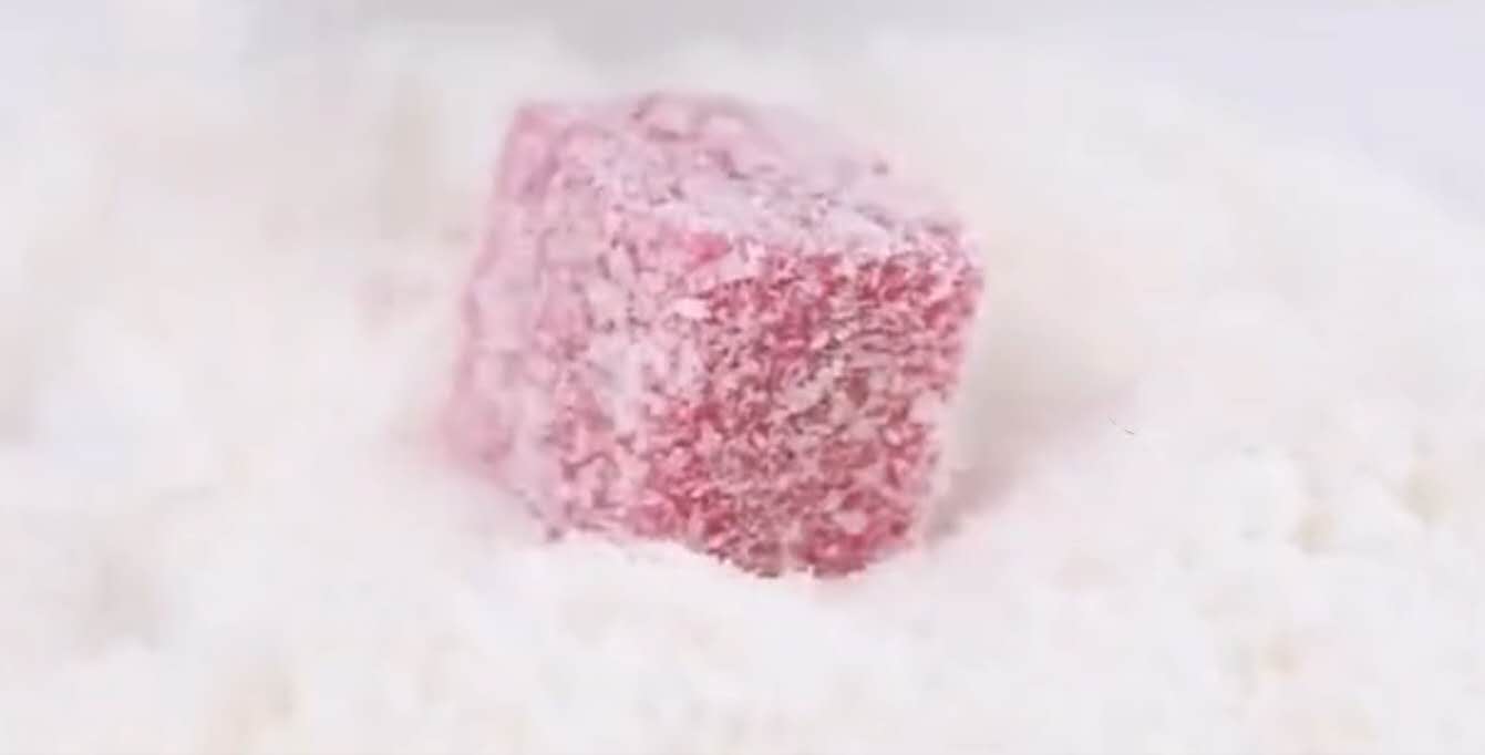 6. 將冷卻凝固成型的火龍果牛奶大方切成小方塊,放進撒有椰絲的容器中稍稍滾動,使小方沾滿椰絲,爽滑細膩的火龍果椰奶小方就做好了。